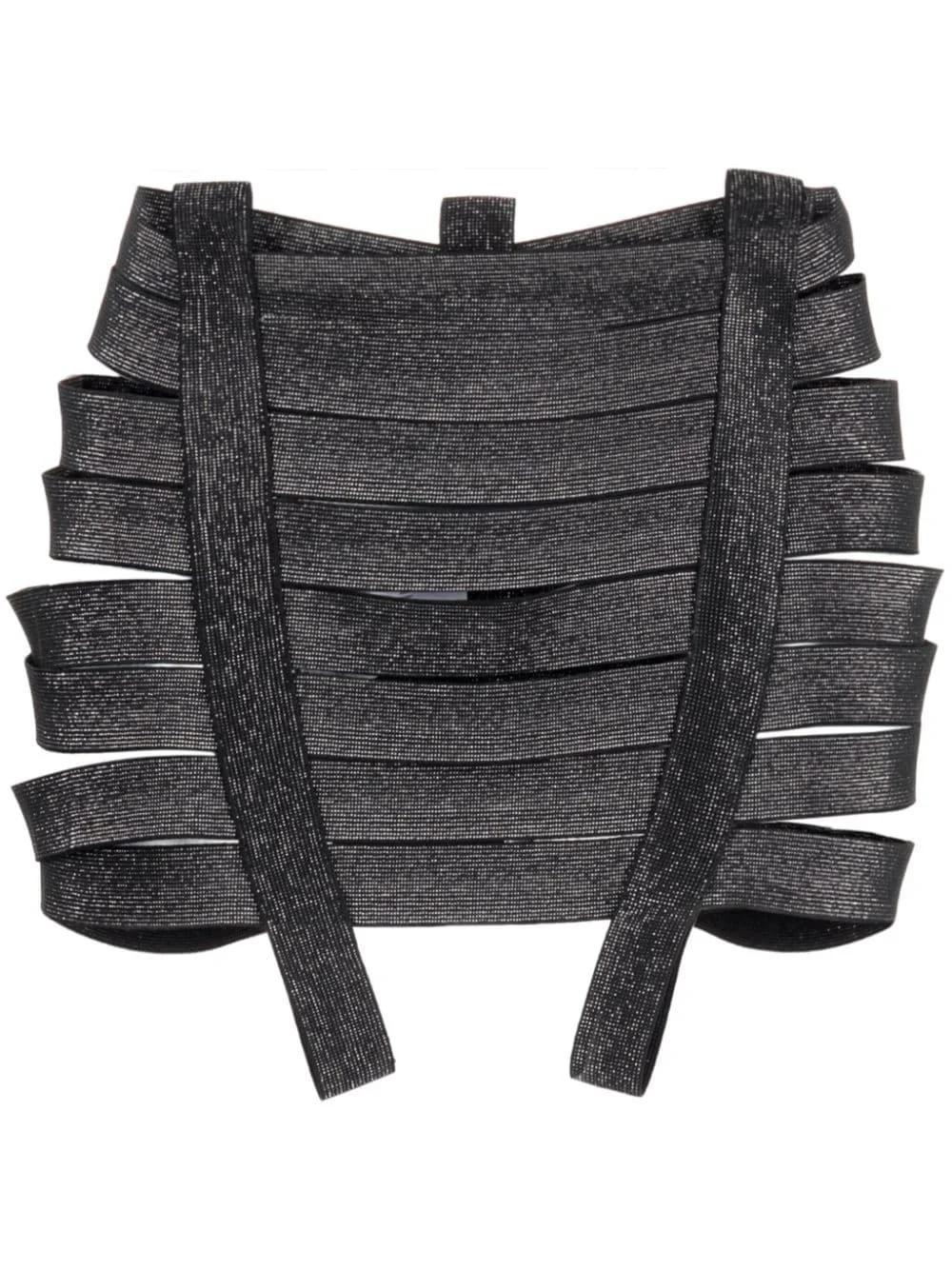 bandeau harness mini skirt Highlights - Black - Rhinestone embellishment - Low-rise - Thigh-length Imported Composition Body: Polyester 100% SIZE & FIT Model measurements Height 5 ft 9 in(1.76 m) Bust/Chest 31.1 in(79 cm) Hips 35.03 in(89 cm) Waist 24.4 in(62 cm) FittingInformation This mini-length skirt is intended to be worn high on the waist Slightly short in length; consider your own measurements Made from a midweight non-stretch fabric, this piece offers minimal elasticity when worn This piece fits close in all sizes – take your usual size