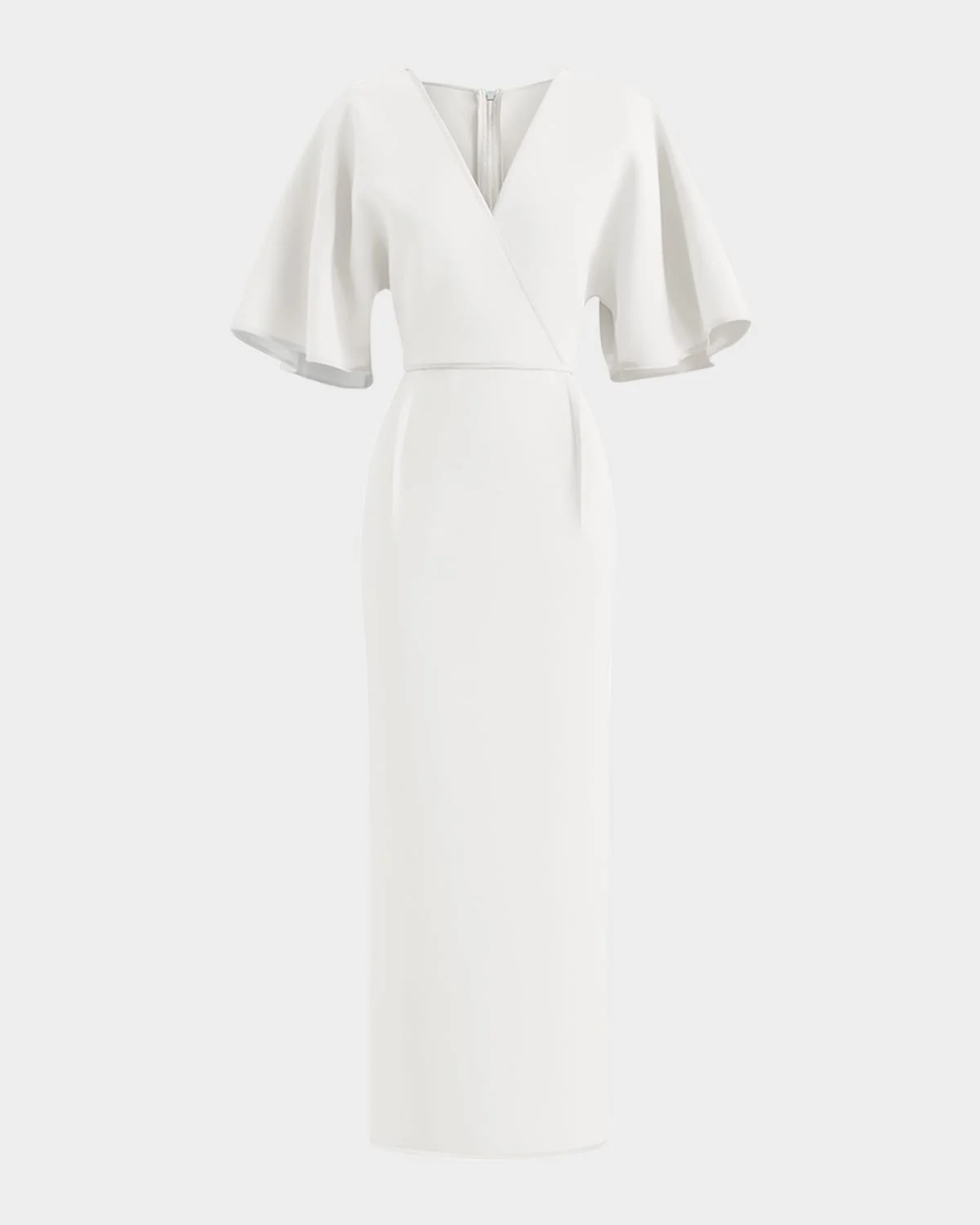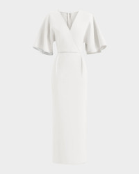 - Maticevski "Benefit" dress featuring inverted darts along the waist and back - Surplice neckline - Short flutter kimono sleeves - Column silhouette - Side slits - Hem falls below the knee - Back zip - Polyester - Dry clean - Made in Australia