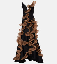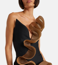 Expect the unexpected with Maticevski, a designer that incorporates artistry and sculptural influence into every piece. Made from wool and silk, the Explode gown has a strapless design with all-over lush ruffles for a striking look. Product Details - Material: 85% wool, 15% silk - Care instructions: dry clean - Made in Australia - Designer color name: Bronze - Item color: black, gold - Material II: 100% polyester - Lining: 93% silk, 7% elastane - Closure: zipped back, hook-fastening back - Boning - Item number: P01079604 Size & Fit - True to size - Ideal fit for larger bust sizes - Strapless - Fitted - Non-stretchy fabric - The model seen in the picture is 178cm-5'10" and wearing a size UK 8