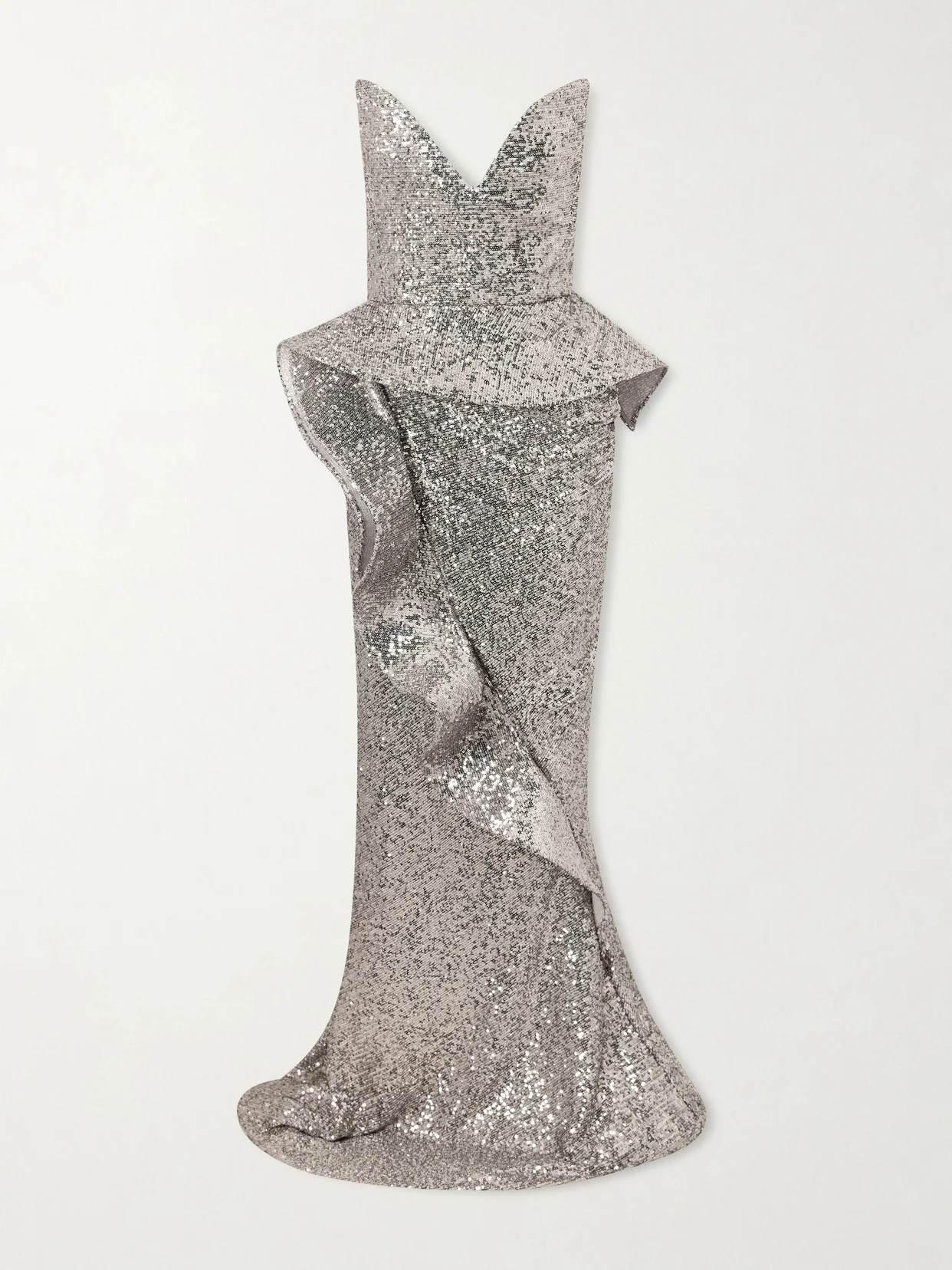 Make heads turn at your next event in Maticevski's 'Glorious' gown. Made from silver sequined crepe, it features an angular strapless neckline and a cascading drape from the waist and across the entire skirt. Complete the look with heels and a diamond necklace.