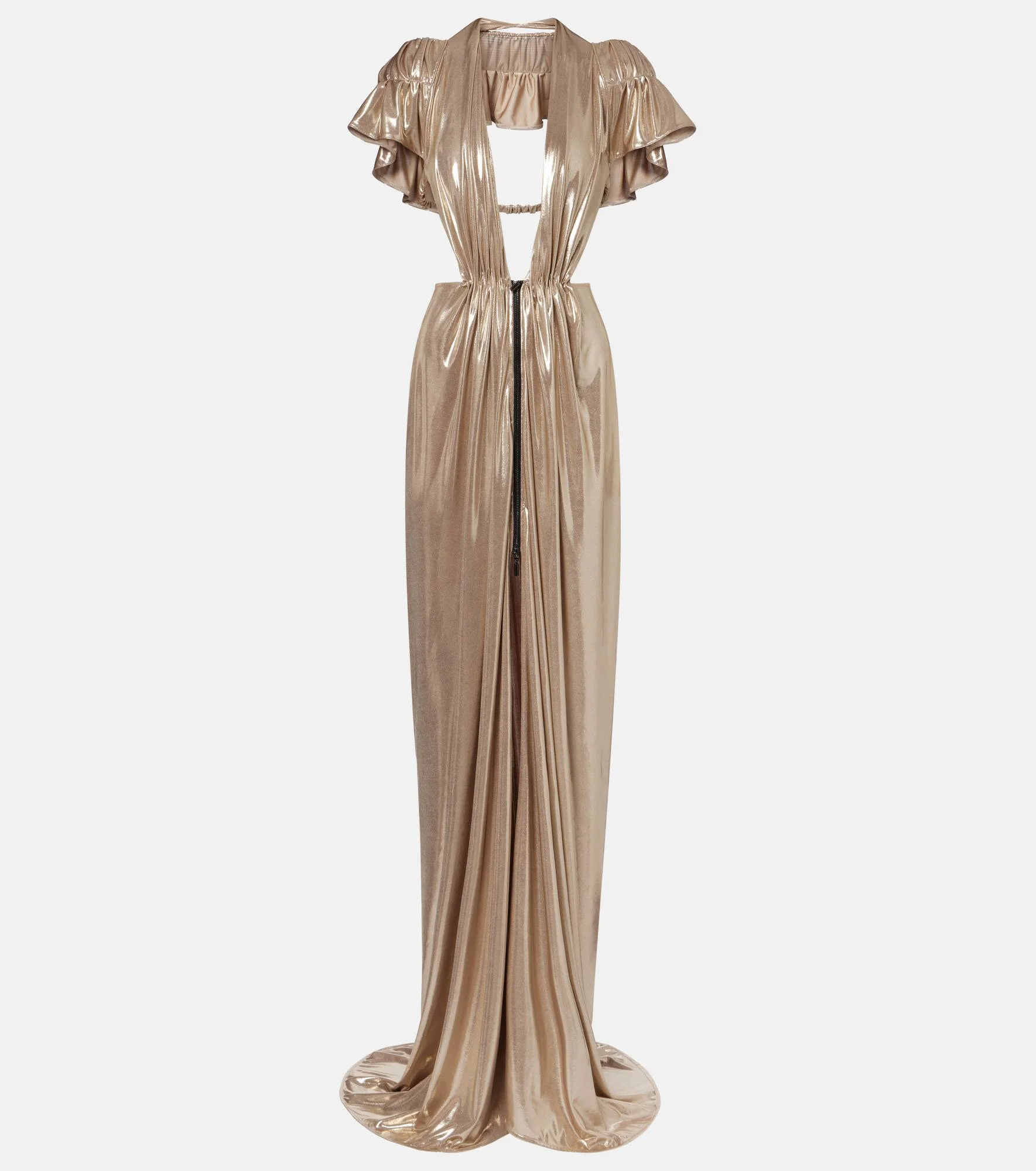 Expect the unexpected with Maticevski, a designer that incorporates artistry and sculptural influence into every piece. The Latitude gown features a plunging neckline, ruffled shoulders, and flattering gathering details along the back and waist. Product Details - Material: 93% polyester, 7% elastane - Care instructions: hand wash - Made in Australia - Designer color name: Gold - Item color: gold - Closure: two-way zipped front - Hardware color: black - Long vent - Item number: P01059366 Size & Fit - True to size - Low back - Cinched waist - Stretchy fabric - The model seen in the picture is 178cm-5'10" and wearing a size UK 8