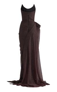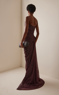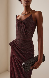 PRODUCT DETAILS - Slim fit, strapless, scoop neck, gathering - Zipper fastening - Lined - Composition: 67% Polyester, 23% Acrylic, 10% Metallic Yarn; Lining 1: 93% Silk, 7% Elastane; Lining 2: 95% Polyester, 5% Spandex - Color: Blood Web - Dry clean only - Pre-Fall '25