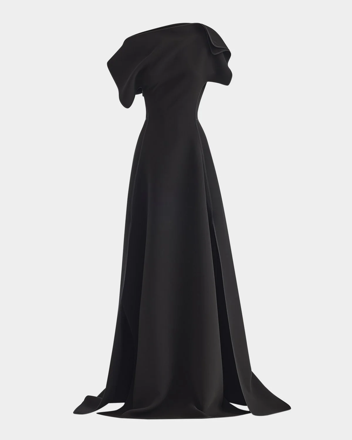 - Maticevski "Synergy" gown featuring pieced panels creating draped sleeves and side slits - Off-the-shoulder neckline - Short sleeves - Side split pockets - A-line silhouette - Floor sweeping hem - Side zip - Polyester - Dry clean - Made in Australia