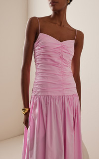 The Australian sister duo delivers their signature vacation-ready minimalism, with a focus on comfort and ease. Designed as part of the exclusive collaboration between Moda Operandi and Matteau, this midi dress is a playful twist on a classic silhouette. Featuring a sweetheart neckline, fine straps and a gathered bodice which extends low on the waist into a full gathered skirt with concealed pockets. Pair with your favourite sandal for celebrations or long lunches under the sun. PRODUCT DETAILS - Pre-Fall '25 - Zip fastening - Composition: 100% organic cotton - Designer color: Rosewater - Dry clean - Made in Australia SIZE & FIT - Designed for a slim fit