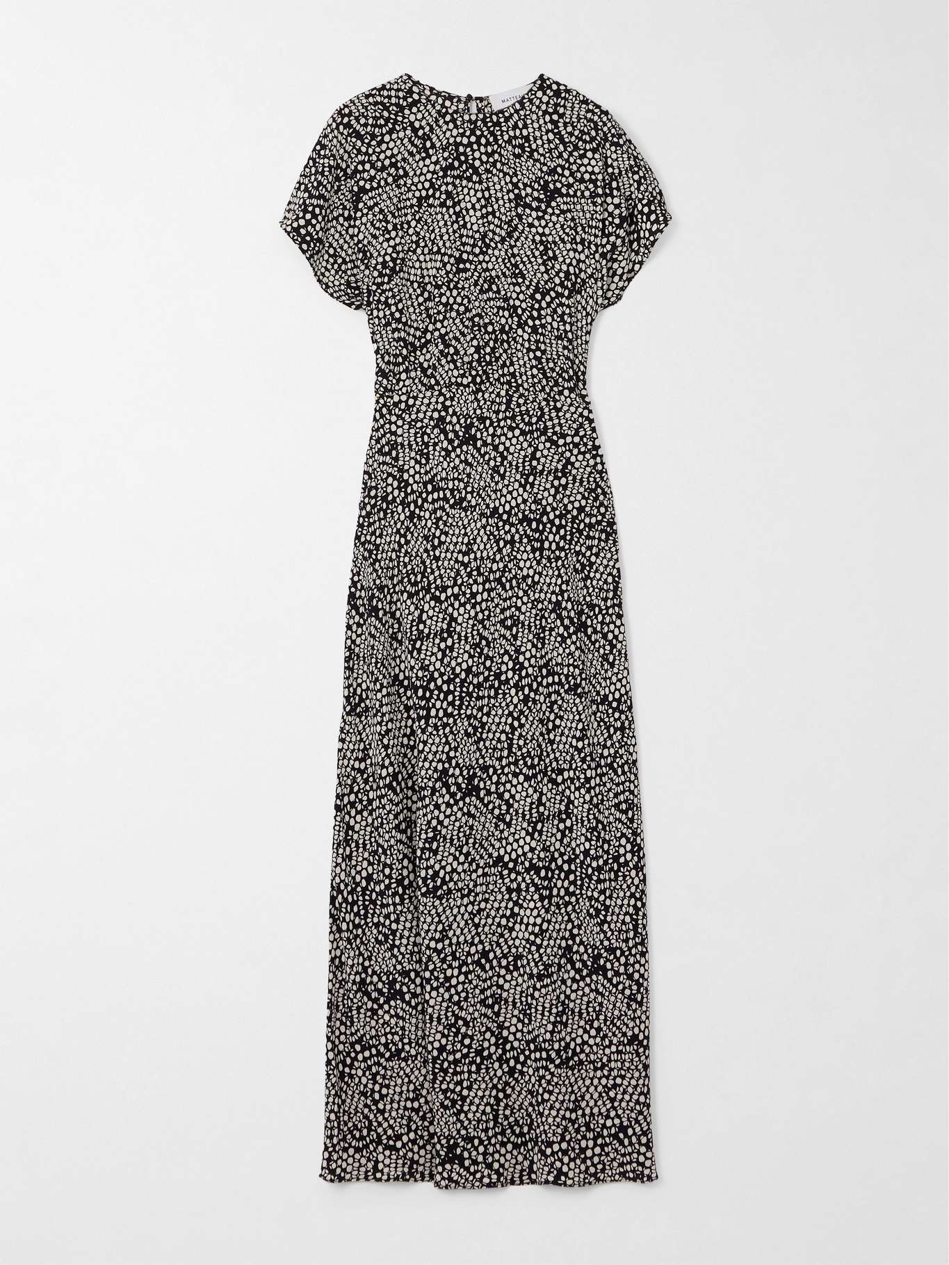 EDITORS'NOTES Guided by a 'less but better' philosophy, Matteau pieces are designed for versatility, longevity and effortless sophistication. This maxi dress is made from printed silk crepe de chine that's gathered to define the waist. It has cap sleeves and a floaty skirt. Wear yours with sandals for summer days in the city. SIZE & FIT - 1 = UK 6/ US 2/ FR 34 - 2 = UK 8/ US 4/ FR 36 - 3 = UK 10/ US 6/ FR 38 - 4 = UK 12/ US 8/ FR 40 - 5 = UK 14/ US 10/ FR 42 - Fits true to size, take your normal size - Designed to be fitted at the hip with a loosely cut top - Lightweight, non-stretchy fabric - Model is 180cm/ 5'11" and is wearing the designer's size 2 - Bust: 86cm/ 34" - Waist: 65cm/ 25.5" - Hip: 90cm/ 35.5" DETAILS & CARE - Black and ecru silk crepe de chine - Button fastening keyhole at back - 100% silk