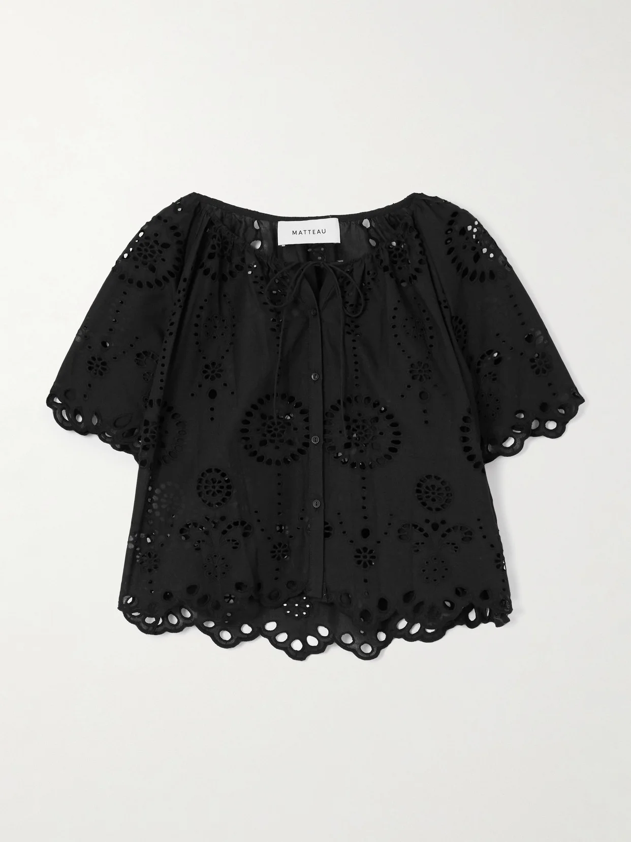 Whether styled as a swim coverup or on its own, Matteau's shirt is a summertime staple. It's made from breathable broderie anglaise cotton-poplin and has scalloped edges along the cuffs and hem. Undo the neck ties and a few buttons to enhance its relaxed feel.