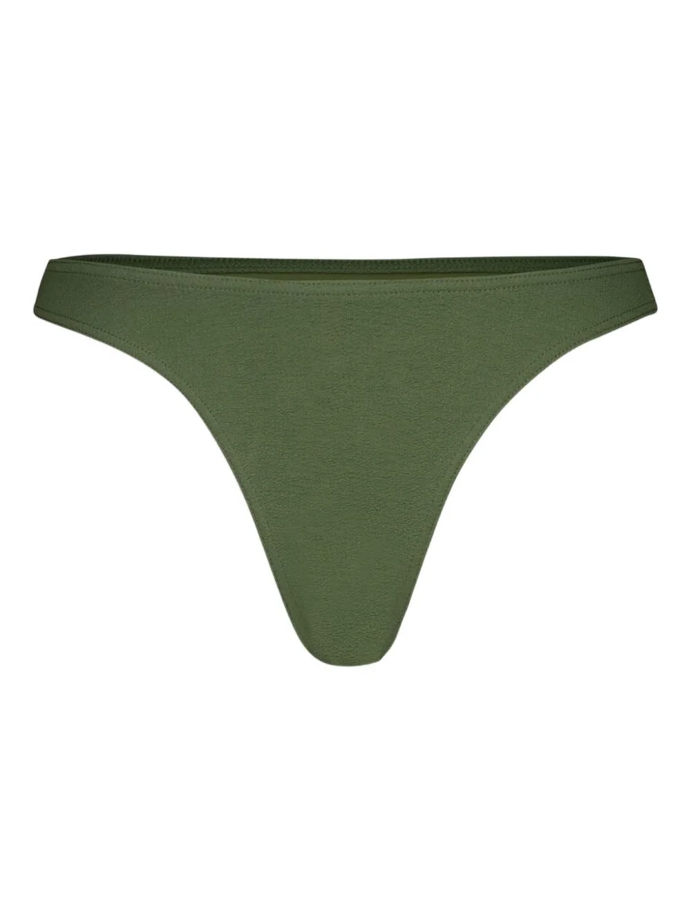 Nineties Brazilian bikini brief Highlights - Olive green - Crinkle texture - Brazilian cut - High-leg - Low-rise - Simple design - Be mindful to try on swimwear over your own garments. Imported Composition Recycled Nylon 80%, Elastane 20%