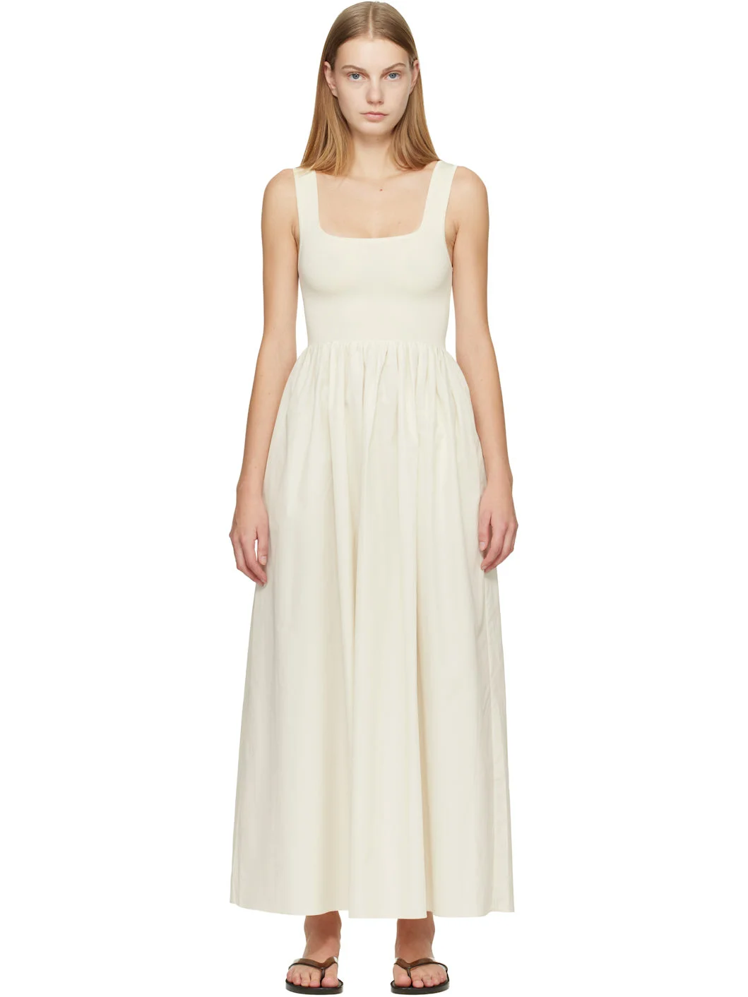 Knit stretch viscose-blend and cotton poplin maxi dress. · FSC-certified viscose · BCI-certified cotton · Square neck · Gathering at waist · Seam pockets Supplier color: Ecru Body 1: 78% viscose, 20% nylon, 2% elastane. Body 2: 100% cotton. Made in Australia 261946F054007