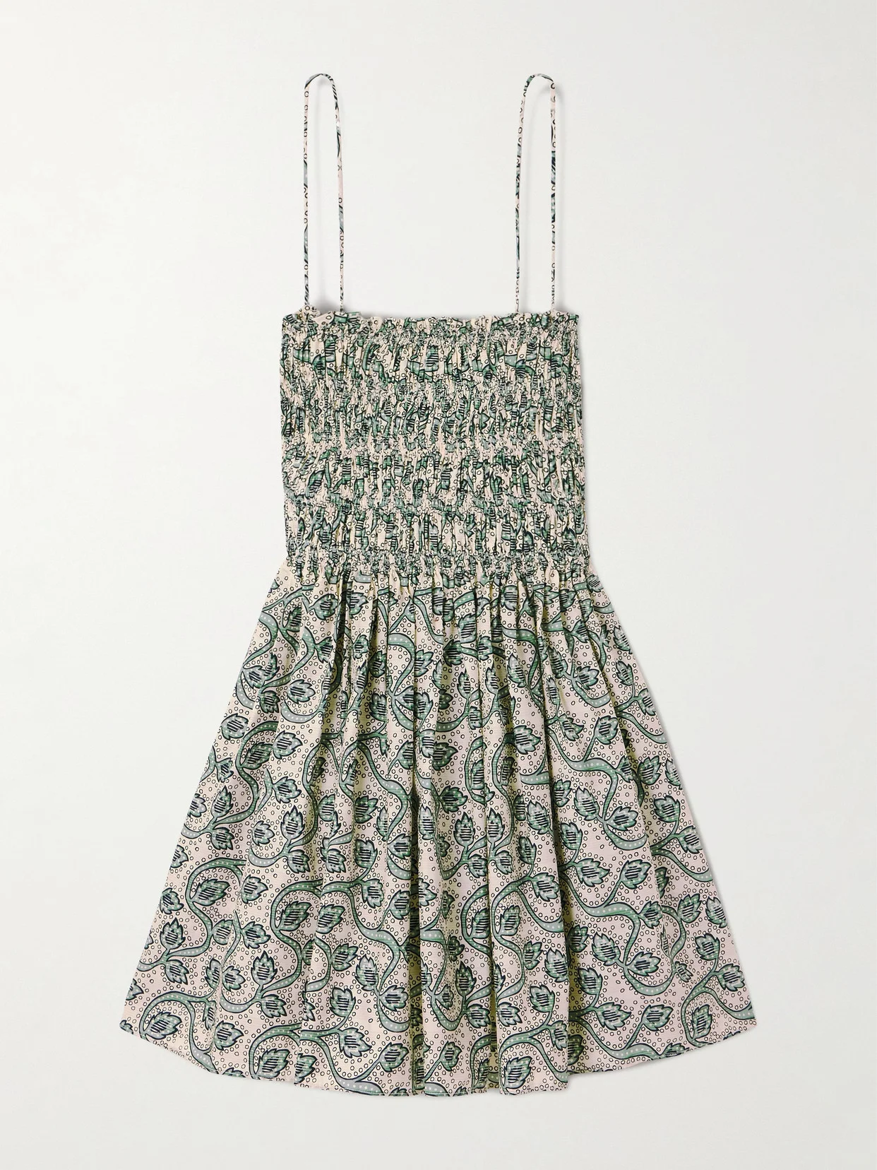 Matteau's dress is cut from organic cotton-poplin and printed with swirling vines. It has a close yet flexible shirred bodice and falls to a flowy mini skirt. This product was Locally Made using Considered Materials. Find out more about NET SUSTAIN here.