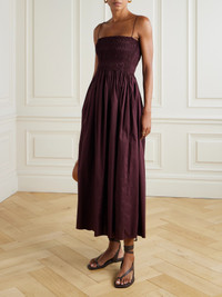 Matteau's midi dress is perfect for warm-weather days when you want to feel cool and look put together. Made from organic cotton, it has a floaty skirt and shirred bodice framed by delicate straps. Complement the burgundy hue with neutral accessories. This product was Locally Made using Considered Materials. Find out more about NET SUSTAIN here.