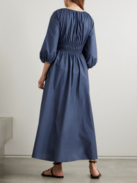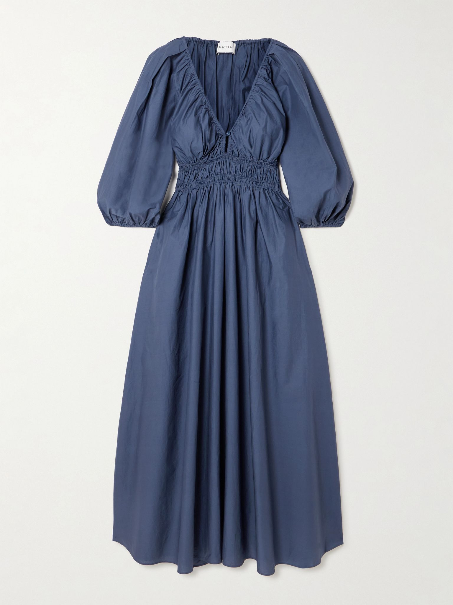 Cut from organic cotton-poplin, Matteau's maxi dress has a gathered neckline, voluminous sleeves and a shirred waist to define your figure. The 'Dusk' shade works both day and night – just swap out your tote bag for a satin clutch. Lower-Impact Materials. This product is made using at least 50% lower-impact materials or ingredients. Find out more about our NET SUSTAIN criteria here. Size & Fit - 1 = UK 6/ US 2/ FR 34 - 2 = UK 8/ US 4/ FR 36 - 3 = UK 10/ US 6/ FR 38 - 4 = UK 12/ US 8/ FR 40 - 5 = UK 14/ US 10/ FR 42 - Fits true to size, take your normal size - Designed to be fitted at the bust, slightly loose at the waist and hip - Lightweight, non-stretchy fabric - Model is 177cm/ 5'10" and is wearing the designer's size 2 Model measurements: - Bust: 85cm/ 33” - Waist: 66cm/ 26” - Hip: 92cm/ 36” Details & Care - Navy organic cotton-poplin - Button-fastening keyhole at front - 100% organic cotton - Machine wash - Designer color: Dusk
