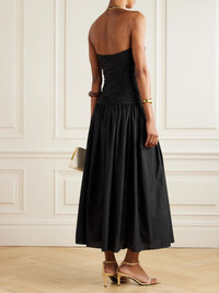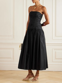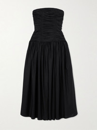 Matteau is committed to creating clothes that not only outlast trends, but also remain in quality condition throughout plenty of wears. This strapless dress is made from organic cotton-poplin that's ruched through the bodice and falls to a floaty, gathered skirt. Wear yours with flats and statement jewelry. Size & Fit - 1 = UK 6/ US 2/ FR 34 - 2 = UK 8/ US 4/ FR 36 - 3 = UK 10/ US 6/ FR 38 - 4 = UK 12/ US 8/ FR 40 - 5 = UK 14/ US 10/ FR 42 - Fits true to size, take your normal size - Designed to be fitted at the bust and waist, slightly loose at the hip - Mid-weight, non-stretchy fabric - Model is 180cm/ 5’11” and is wearing the designer's size 2 Model measurements: - Bust: 86cm/ 34" - Waist: 65cm/ 25.5" - Hip: 90cm/ 35.5" Details & Care - Black organic cotton-poplin - Concealed hook and zip fastening at side - 100% organic cotton - Dry clean