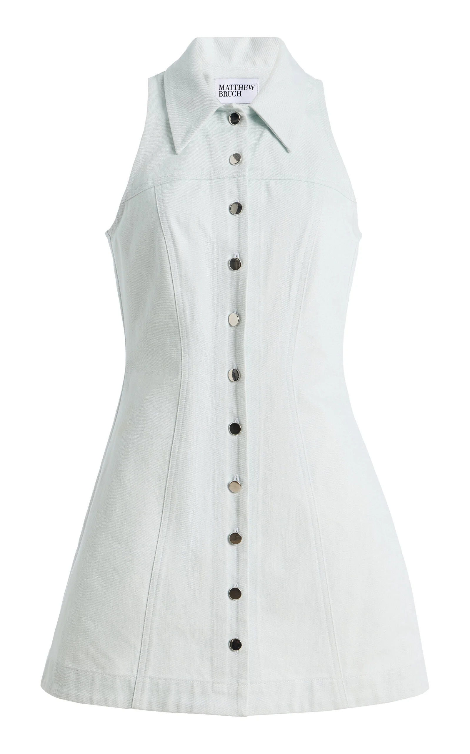 The New York talent blends considered design with a fuss-free minimalism to create cool vacation pieces that easily translate to city life. Halter denim seamed mini dress wiht silver buttons down front. PRODUCT DETAILS - Spring '26 - Buttons up front - Composition: 100% cotton - Dry clean - Handmade in the USA SIZE & FIT - True To Size - Model is wearing a size 0