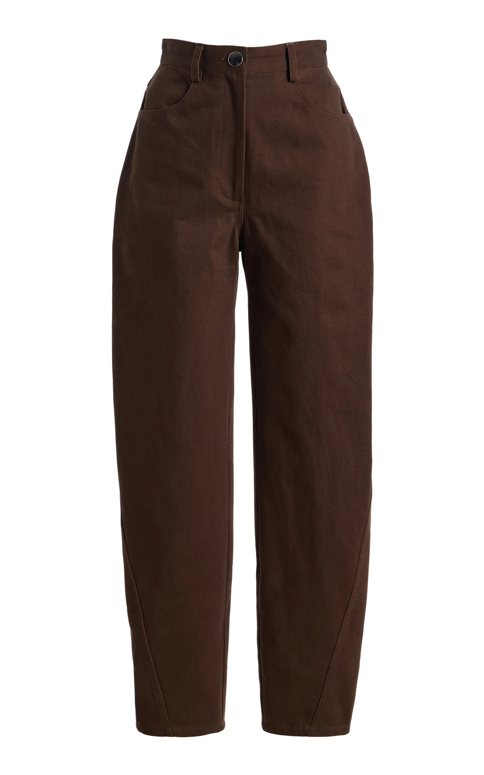 The New York talent blends considered design with a fuss-free minimalism to create cool vacation pieces that easily translate to city life. Denim twist leg seam with silver button detail. PRODUCT DETAILS - Spring '26 - Front zipper fly and waistband button - Composition: 100% cotton - Designer color: Chocolate - Dry clean - Handmade in the USA SIZE & FIT - True To Size - Model is wearing a size 0