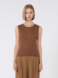 DETAILS Sleeveless top, featuring a flat-rib knit that highlights the silhouette. Silk and wool yarn top Figure-hugging Crew neck and wide shoulder Ribbed edges COMPOSITION AND CARE 55% silk, 45% wool. Hand wash cold (40°c max); do not bleach; do not tumble dry; flat drying in the shade; cool iron; professionally dry clean perchloroethylene - mild process; do not wet clean.; iron with a cloth between.; using neutral detergent. Distributed by Max Mara S.r.l., registered office in Reggio Emilia (Italy), Via Giulia Maramotti 4, 42124 (IT)