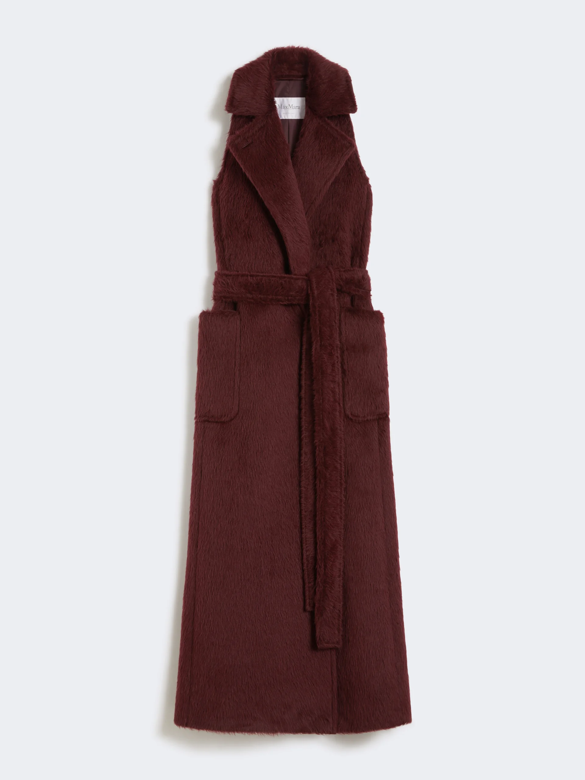DETAILS Long, sleeveless coat featuring a distinctive, wrap silhouette. Coat in alpaca and wool fabric with a soft texture Loose fit Lapel collar Matching belt fastening Pockets at the front Centre slit on the back Lined COMPOSITION AND CARE Fabric 75% alpaca, 25% virgin wool; lining 100% viscose. Do not wash; do not bleach; do not tumble dry; cool iron; professionally dry clean perchloroethylene - mild process; do not wet clean.; do not iron the buttons.; protect buttons before washing.; contains non-textile parts of animal origin. Distributed by Max Mara S.r.l., registered office in Reggio Emilia (Italy), Via Giulia Maramotti 4, 42124 (IT)