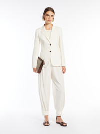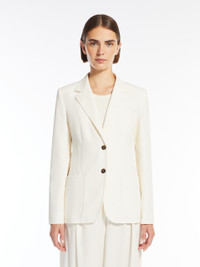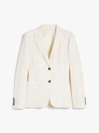 DETAILS Slim-fit single-breasted blazer made from ultra-light pure cotton fabric. Finished with a viscose yarn insert at the back. Half-lined style in jacquard monogram fabric, with a lapel collar, breast pocket, and patch pockets on the front. Button fastening. COMPOSITION AND CARE Fabric 100% cotton; jersey fabric 96% viscose, 4% polyester; lining 54% viscose, 46% cotton. Do not wash; do not bleach; do not tumble dry; cool iron; professionally dry clean perchloroethylene - mild process; do not wet clean; flat drying in the shade.; put this item into a string bag before washing it.; wash the garment while it is fastened.; protect buttons before washing. Distributed by Max Mara S.r.l., registered office in Reggio Emilia (Italy), Via Giulia Maramotti 4, 42124 (IT)