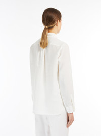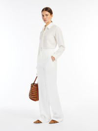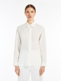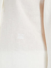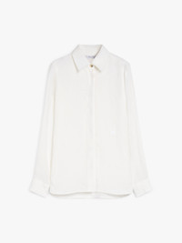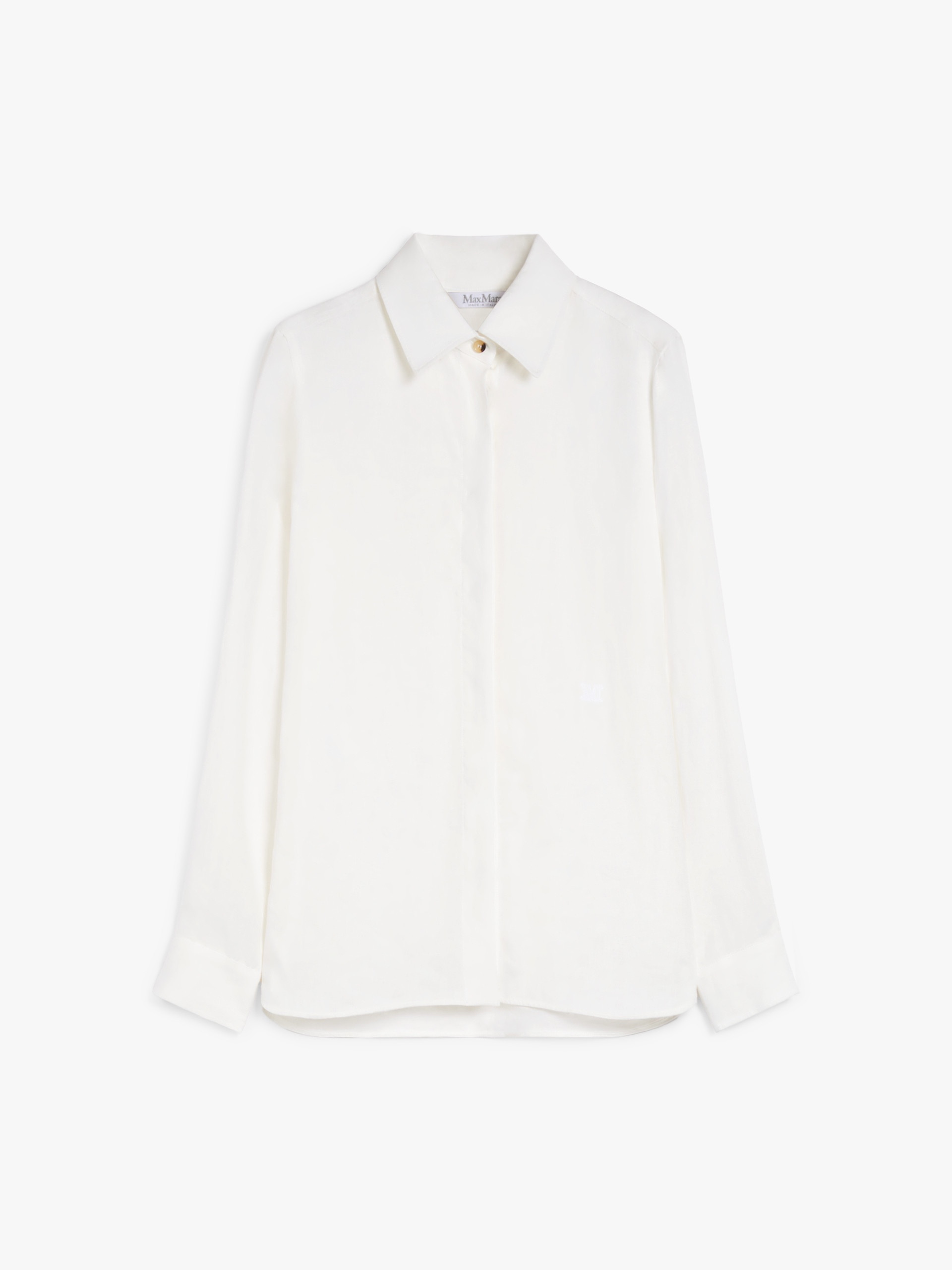 DETAILS Masculine-inspired shirt, made from lightweight pure linen fabric. Relaxed-fit style with a classic pointed collar, long sleeves with cuffs and a side button, yoke cut and pleat on the back. Customised on the side with a small M Monogram thread embroidery and an asymmetrical hem slightly longer at the back with side slits. Concealed button fastening at the front. COMPOSITION AND CARE Fabric 100% flaxlinen; - exclusive of embroideries. Do not wash; do not bleach; do not tumble dry; cool iron; professionally dry clean perchloroethylene - mild process; do not wet clean.; wash the garment while it is fastened.; do not iron the buttons.; protect buttons before washing.; turn the articles inside out before washing.; contains non-textile parts of animal origin. Distributed by Max Mara S.r.l., registered office in Reggio Emilia (Italy), Via Giulia Maramotti 4, 42124 (IT)