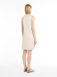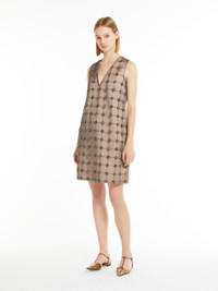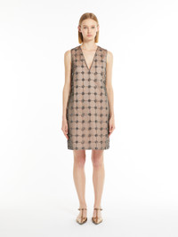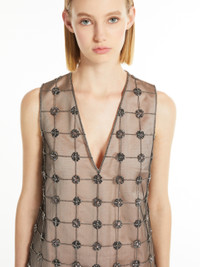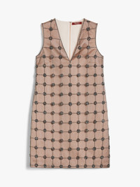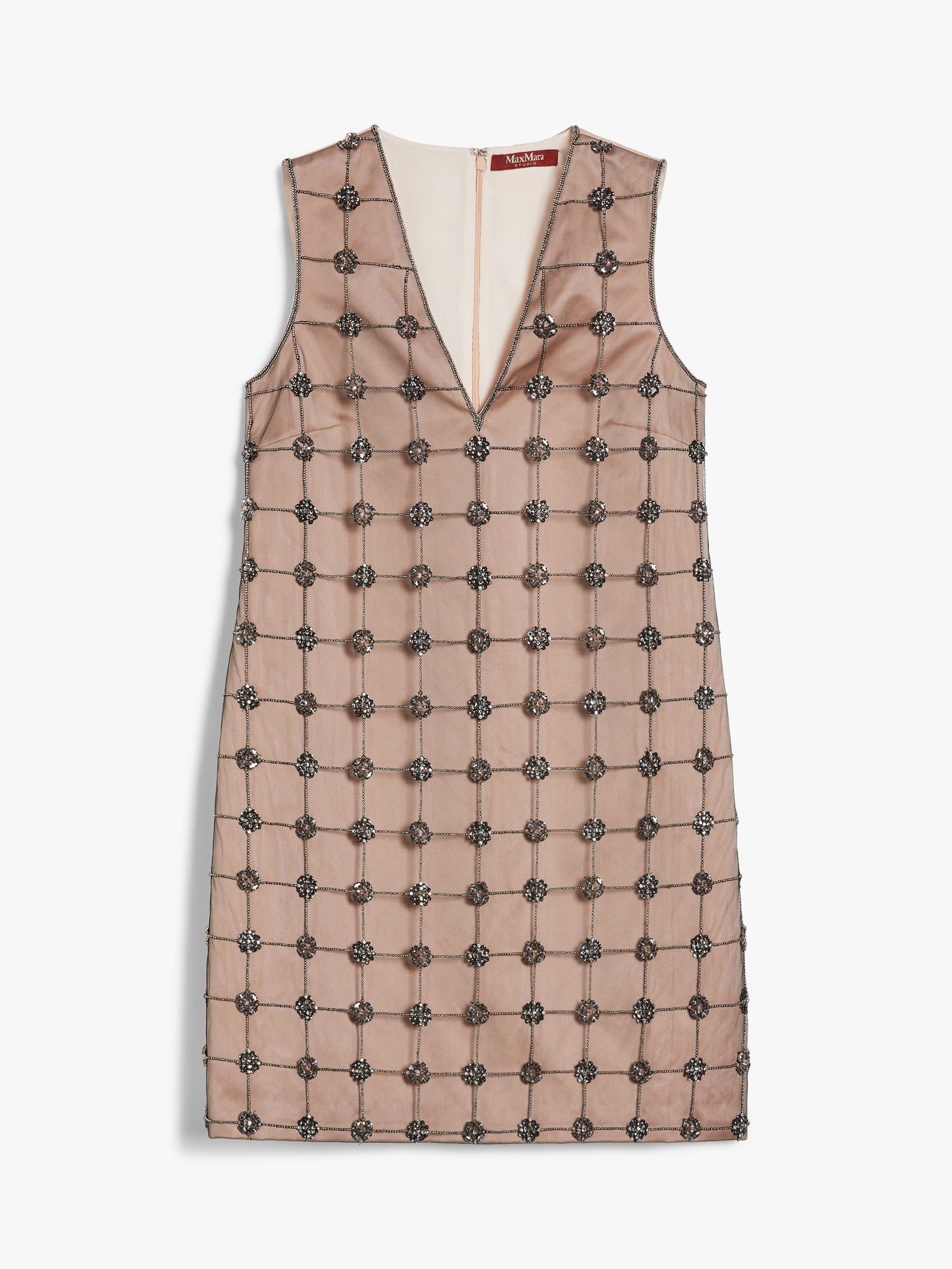 DETAILS Short sleeveless dress with a deep V-neck, made of duchess satin. Flared style, embellished with a delicate front panel in tulle with a geometric design composed of hand-embroidered crystals and beads. Lined style with concealed zip fastening on the back. COMPOSITION AND CARE Fabric 100% polyester; tulle 100% polyamide; joining thread 100% polyester; - exclusive of decoration; lining 85% acetate, 10% silk, 5% polyamide. Do not wash; do not bleach; do not tumble dry; cool iron; professionally dry clean perchloroethylene - mild process; do not wet clean.; put this item into a string bag before washing it.; do not iron the decoration. Distributed by Max Mara S.r.l., registered office in Reggio Emilia (Italy), Via Giulia Maramotti 4, 42124 (IT)