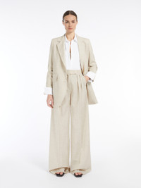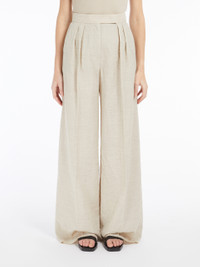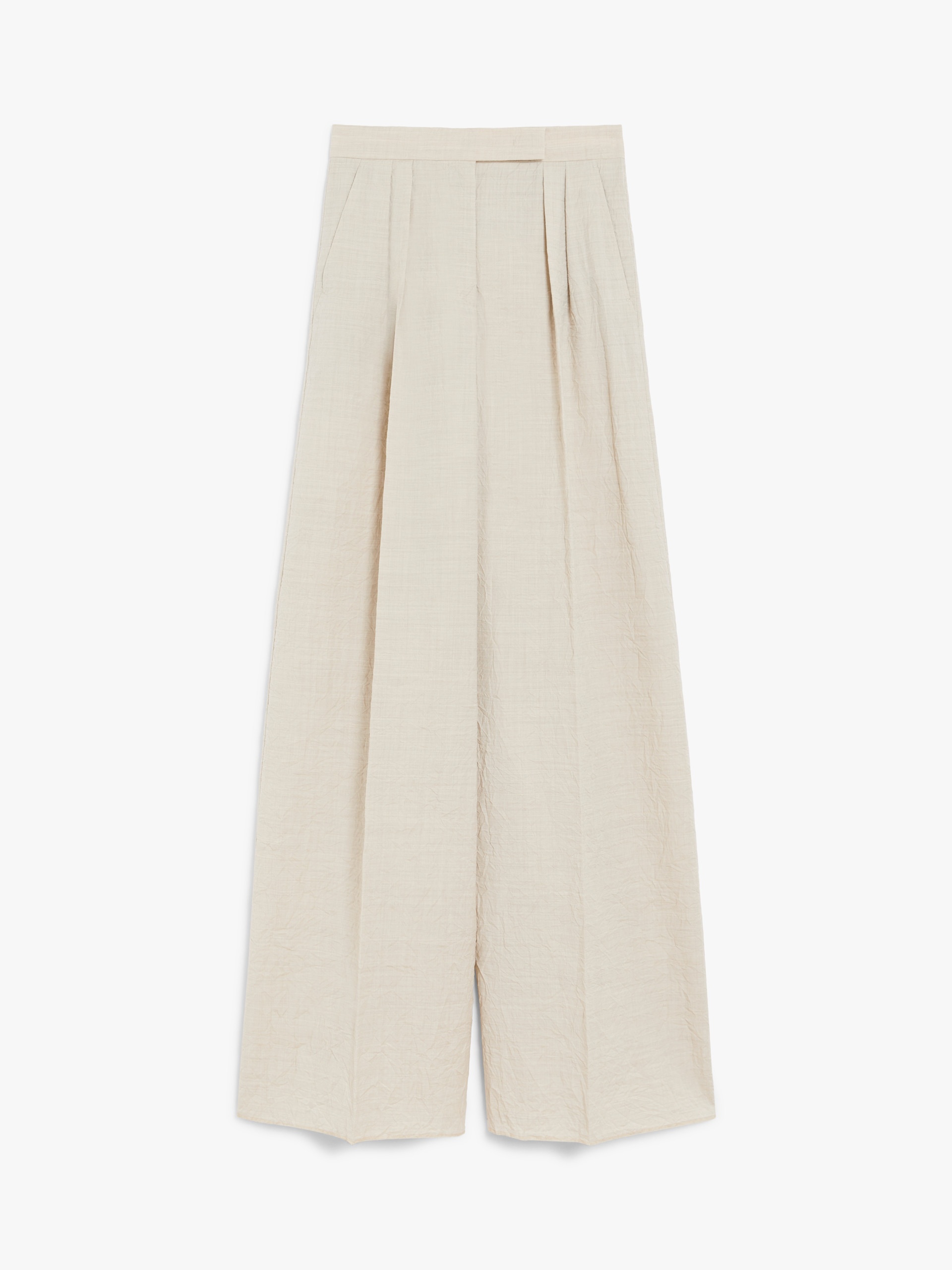 DETAILS Wide leg trousers, made of pure wool cloth with a characteristic crumpled texture. This design features a wide-leg silhouette, double pleats at the front of the waist, side slant pockets and buttoned welt pockets at the back. Fastened with a wide waistband tab, zip fly and small hook. COMPOSITION AND CARE 100% virgin wool. Do not wash; do not bleach; do not tumble dry; cool iron; professionally dry clean perchloroethylene - mild process; do not wet clean.; do not iron the buttons.; protect buttons before washing.; when ironing, take care not to flatten the wavy look of the fabric.; contains non-textile parts of animal origin. Distributed by Max Mara S.r.l., registered office in Reggio Emilia (Italy), Via Giulia Maramotti 4, 42124 (IT)