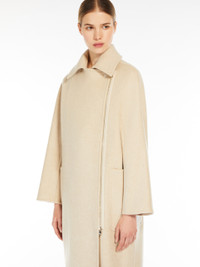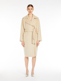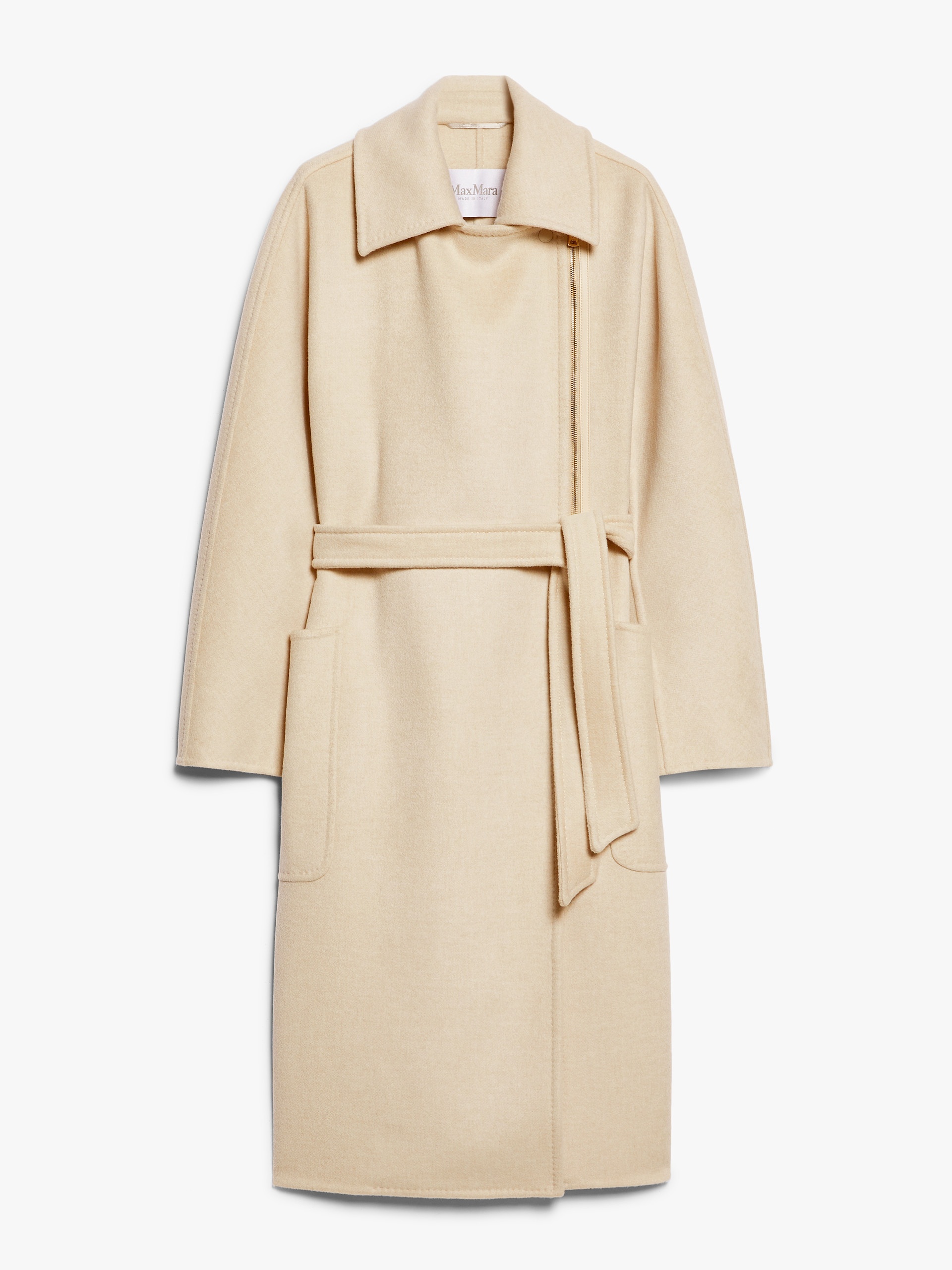 DETAILS Midi coat partially hand-sewn and in a luxurious pure wool double cloth. The garment features a dual-use lapel collar, large patch pockets on the front and wide kimono sleeves. Finished with a central slit at the back. Asymmetric metallic double-slider zip fastening on the front. The matching belt accentuates the silhouette. COMPOSITION AND CARE Fabric 100% virgin wool; - except joining thread. Do not wash; do not bleach; do not tumble dry; cool iron; professionally dry clean perchloroethylene - mild process; do not wet clean.; wash the garment while it is fastened.; do not wash or dry clean by fabric methods. clean only by leather and fur specialists.; do not iron the real leather details.; turn the articles inside out before washing.; contains non-textile parts of animal origin. Distributed by Max Mara S.r.l., registered office in Reggio Emilia (Italy), Via Giulia Maramotti 4, 42124 (IT)