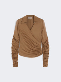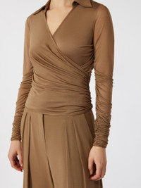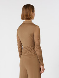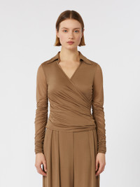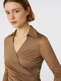 DETAILS Long-sleeved blouse featuring gathers and drapes on the bodice and sleeves. The main fabric of this garment contains raw materials derived from wood cellulose, a fibre produced with respect for the forest Blouse in fluid viscose jersey and overlapped tulle Figure-hugging Wrap-over V-neck with shirt collar Concealed zip fastening at the side Tulle sleeves COMPOSITION AND CARE Jersey fabric 1 100% viscose; jersey fabric 2 93% viscose, 7% elastane; lining 93% viscose, 7% elastane. Do not wash; do not bleach; do not tumble dry; cool iron; professionally dry clean perchloroethylene - mild process; do not wet clean.; iron with a cloth between.; put this item into a string bag before washing it. Distributed by Max Mara S.r.l., registered office in Reggio Emilia (Italy), Via Giulia Maramotti 4, 42124 (IT)