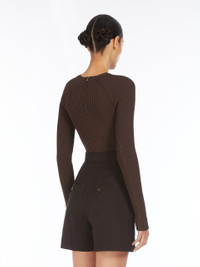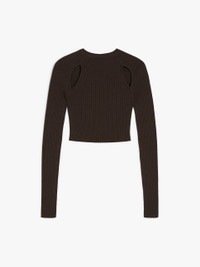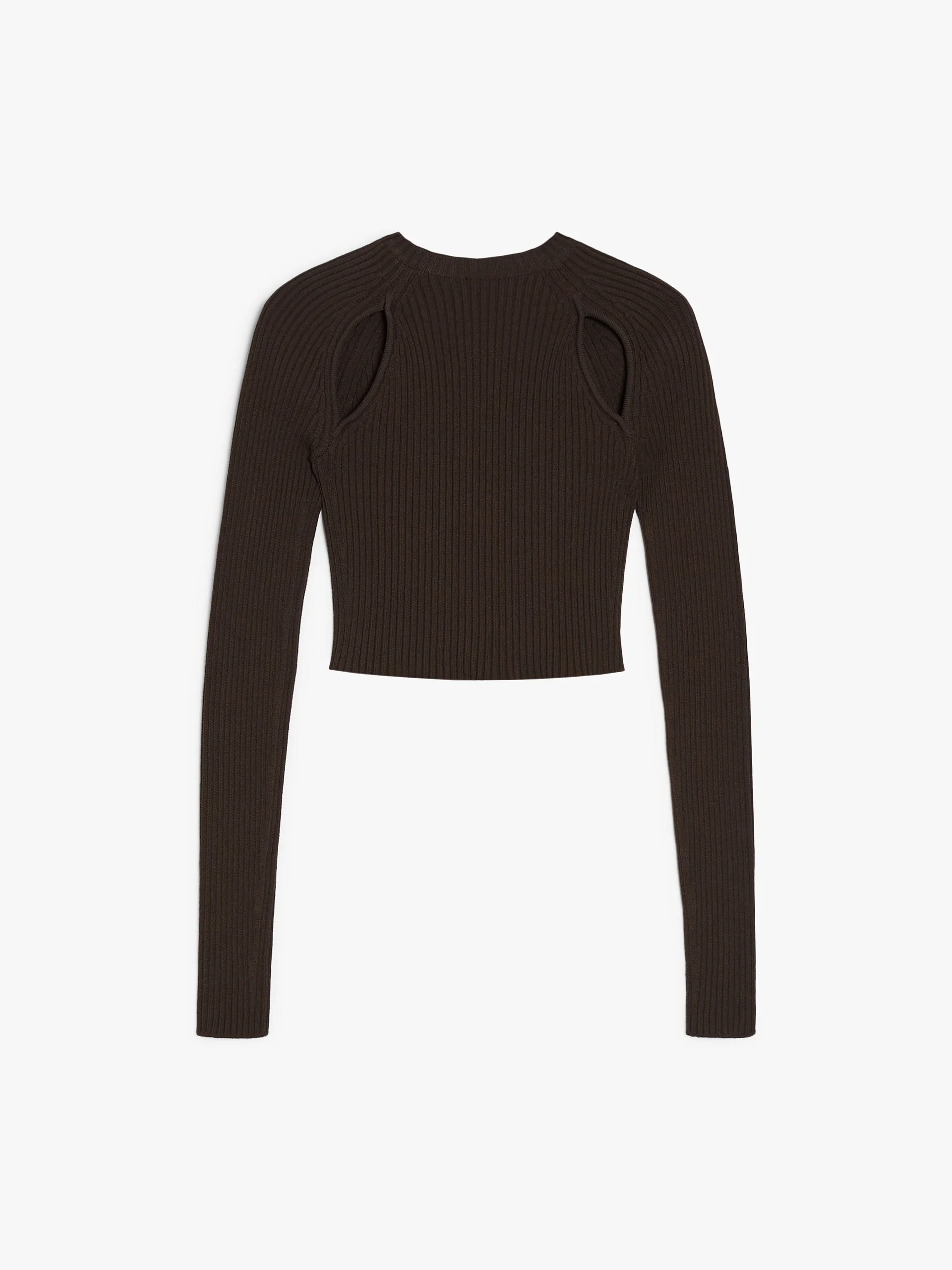 DETAILS Long-sleeved, cropped jumper in stretch viscose crepe yarn. The garment is defined by a rib knit that accentuates the fitted silhouette, round neckline and cut-out details on the shoulders. Zip fastening on the back with logo slider. COMPOSITION AND CARE 75% viscose, 25% polyester. Hand wash cold; do not bleach; do not tumble dry; flat drying in the shade; cool iron; professionally dry clean perchloroethylene - mild process; do not wet clean.; iron with a cloth between.; using neutral detergent. Distributed by Max Mara S.r.l., registered office in Reggio Emilia (Italy), Via Giulia Maramotti 4, 42124 (IT)