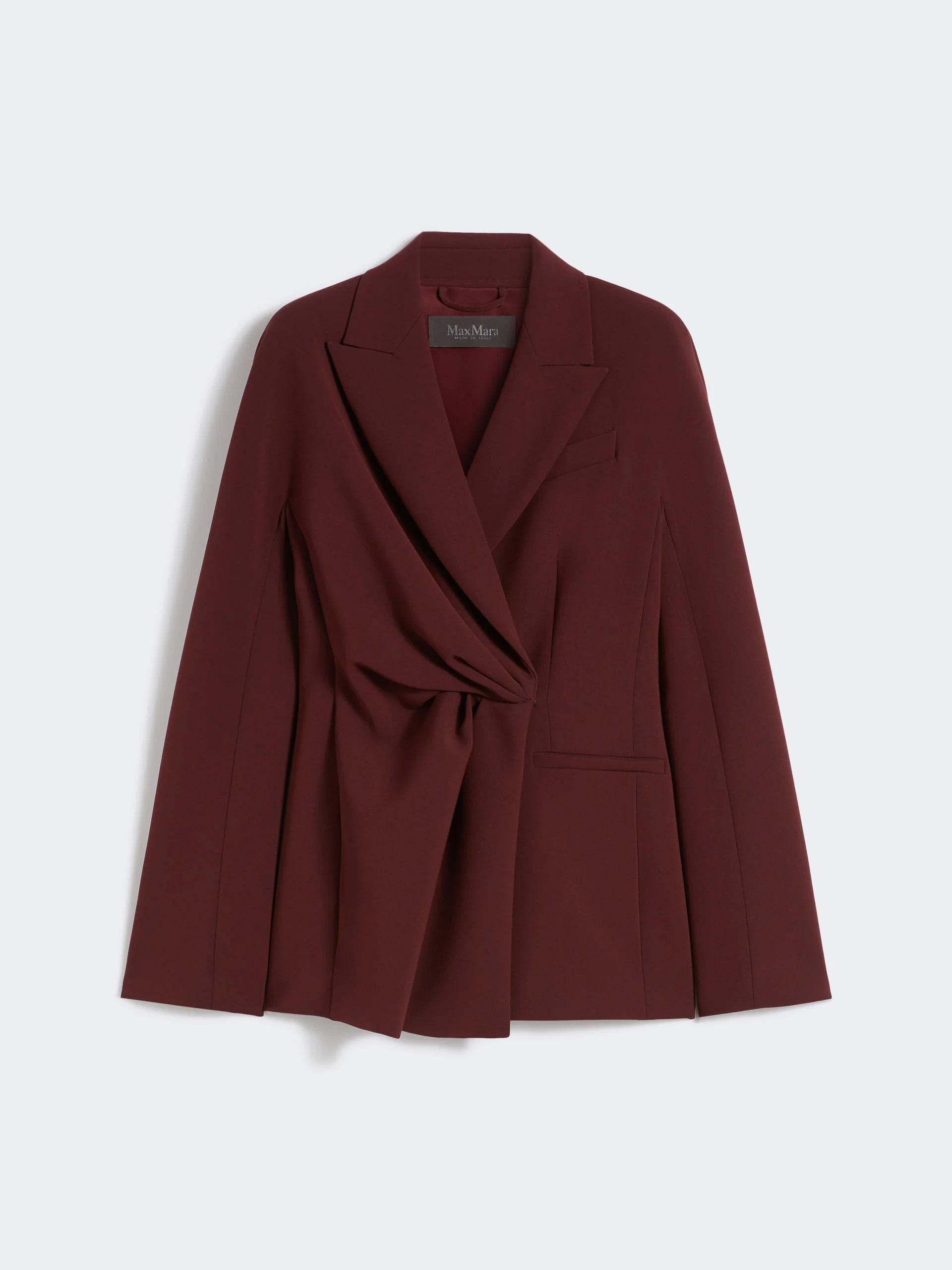 DETAILS Jacket with a feminine, crossover silhouette, featuring a draped motif on the right side. Heavy cady jacket Fitted with central slit at the back. Collar with peak lapels Long kimono sleeves with hidden-button cuffs Snap button closure at waist Breast pocket and asymmetrical left welt pocket Lined COMPOSITION AND CARE Fabric 70% triacetate, 30% polyester; lining 85% acetate, 10% silk, 5% polyamide. Do not wash; do not bleach; do not tumble dry; cool iron; professionally dry clean perchloroethylene - mild process; do not wet clean.; do not iron the buttons. Distributed by Max Mara S.r.l., registered office in Reggio Emilia (Italy), Via Giulia Maramotti 4, 42124 (IT)