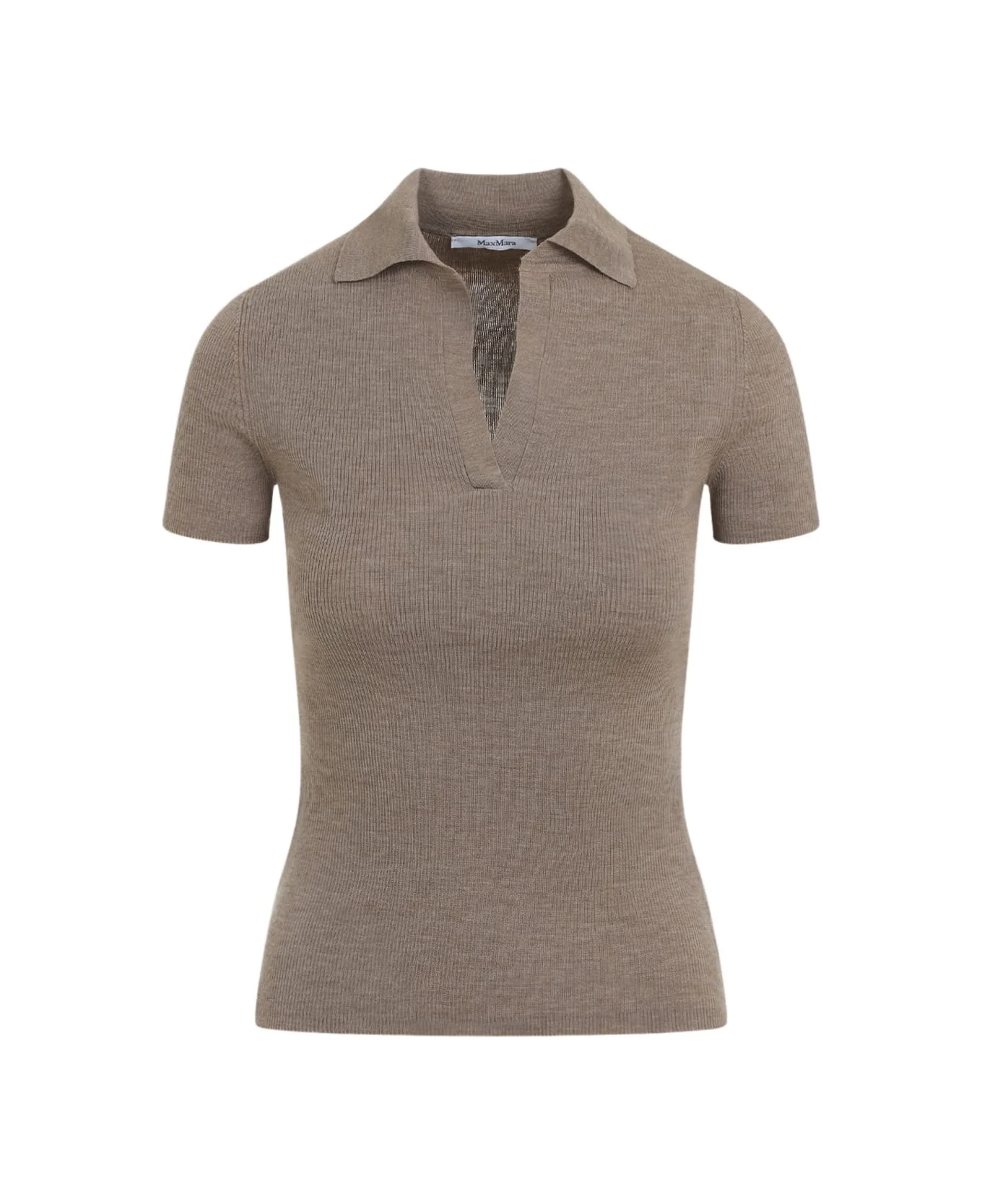 Max Mara Tobacco Light Brown Virgin Wool Albero Knit Ribbed Polo. Pure tobacco light brown virgin wool polo, pointed collar with v-neck, short sleeves, straight hem, ribbed all-over. Made in: Italy Color: Tabacco Chiaro Model number: 2611361171600009