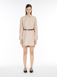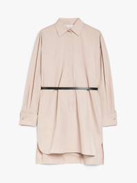 DETAILS Short pure cotton poplin shirt dress. Straight-cut, slightly oversized style with an inset back panel in the cape-effect yoke. Unlined, it is completed by a classic pointed collar, long sleeves with high cufflink cuffs, patch pockets on the front with double stitching and rounded side slits. The matching leather belt accentuates the silhouette. Fastens at the front with concealed buttons to the waist. COMPOSITION AND CARE Dress fabric 100% cotton; with belt in cattle. Dress: machine wash cold delicate cycle; do not bleach; do not tumble dry; line drying in the shade; cool iron; professionally dry clean perchloroethylene - mild process.; Wash the garment while it is fastened.; Do not iron the buttons.; Turn the articles inside out before washing.; Remove the cufflinks before washing.; Contains non-textile parts of animal origin. Belt: do not wash; do not bleach; do not tumble dry; do not iron; do not dry clean; do not wet clean. Distributed by Max Mara S.r.l., registered office in Reggio Emilia (Italy), Via Giulia Maramotti 4, 42124 (IT)