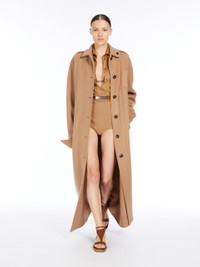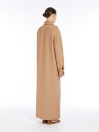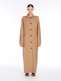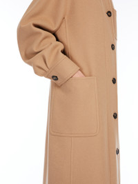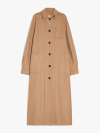 DETAILS Long coat made of a lightweight and luxurious wool and cashmere double cloth that is sewn by hand. Unlined garment featuring a straight silhouette with shirt details: fold-down collar and fastened with a decorative button on the left side, chest pocket with stitched M motif and two patch pockets on the front. Featuring long kimono sleeves with shirt cuffs and stitched darts motif at the shoulders. Front closure with visible buttons along the entire length. COMPOSITION AND CARE Fabric 90% virgin wool, 10% cashmere; - except joining thread. Do not wash; do not bleach; do not tumble dry; cool iron; professionally dry clean perchloroethylene - mild process; do not wet clean.; do not iron the buttons.; protect buttons before washing.; contains non-textile parts of animal origin. Distributed by Max Mara S.r.l., registered office in Reggio Emilia (Italy), Via Giulia Maramotti 4, 42124 (IT)