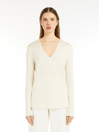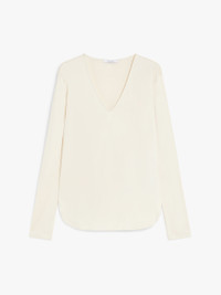 DETAILS Long-sleeved T-shirt in soft pure silk interlock fabric. The V-neck model boasts small rounded side slits and a subtle high-low asymmetrical hem design. Topstitching-decorated trims. The garment comes in a dedicated packaging with branded mothproof cedar wood protectors. COMPOSITION AND CARE 100% silk. Hand wash cold; do not bleach; do not tumble dry; flat drying in the shade; cool iron; professionally dry clean perchloroethylene - mild process; do not wet clean.; iron with a cloth between.; iron into original measurements.; using neutral detergent.; don’t rub.; turn the articles inside out before washing.; to be ironed on reverse. Distributed by Max Mara S.r.l., registered office in Reggio Emilia (Italy), Via Giulia Maramotti 4, 42124 (IT)