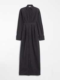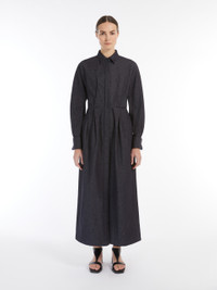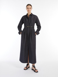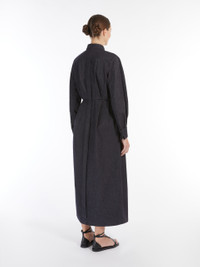 DETAILS Long shirt dress made of pure cotton denim-effect fabric. The garment features a unique silhouette, defined by a waist seam and a full skirt with stitched pleats that add volume. Classic shirt collar, long sleeves with wide cuff and cufflink button. The matching belt allows you to accentuate the waist. Concealed front fastening with deep central slit at the hem. COMPOSITION AND CARE 100% cotton. Machine wash cold delicate cycle; do not bleach; do not tumble dry; line drying in the shade; cool iron; professionally dry clean perchloroethylene - mild process.; wash the garment while it is fastened.; turn the articles inside out before washing.; remove the cufflinks before washing.; contains non-textile parts of animal origin. Distributed by Max Mara S.r.l., registered office in Reggio Emilia (Italy), Via Giulia Maramotti 4, 42124 (IT)