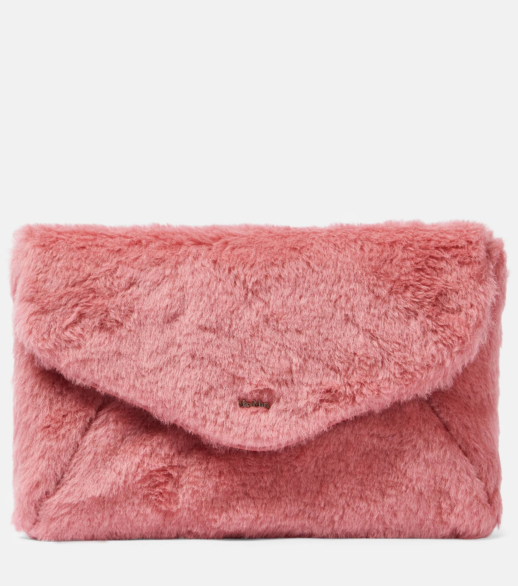 Made from a luxuriously soft blend of alpaca, wool, and silk, Max Mara’s lovable teddy fabric makes the perfect gift (or treat for yourself). From the oh-so-cozy exclusive capsule, this pink-hued clutch is a classic envelope style adorned with the brand’s logo on the flap. Product Details - Material: fabric - Lining: fabric, leather - Made in Italy - Includes: dust bag - Designer color name: Pink - Internal details: internal zipped pocket, internal slot pocket - Closure: magnetic fastening - Item number: P00860970 Size & Fit - Height 22cm-8.5" - Width 34cm-13.5" - Depth 5cm-2"