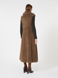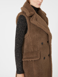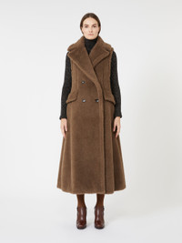 DETAILS Long sleeveless coat, featuring an oversized, redingote silhouette. Coat made of alpaca and wool Teddy fabric on a silk base Fitted at the waist, flared at the hem Lapel collar Double-breasted closure with four visible buttons Pockets with flaps at the front Lined COMPOSITION AND CARE Jersey fabric 62% alpaca, 26% virgin wool, 12% silk; lining 100% viscose. Do not wash; do not bleach; do not tumble dry; do not iron; professionally dry clean perchloroethylene - mild process; do not wet clean.; protect buttons before washing.; contains non-textile parts of animal origin. Distributed by Max Mara S.r.l., registered office in Reggio Emilia (Italy), Via Giulia Maramotti 4, 42124 (IT)