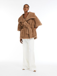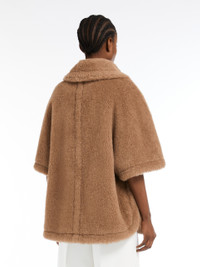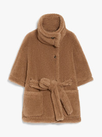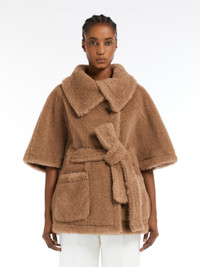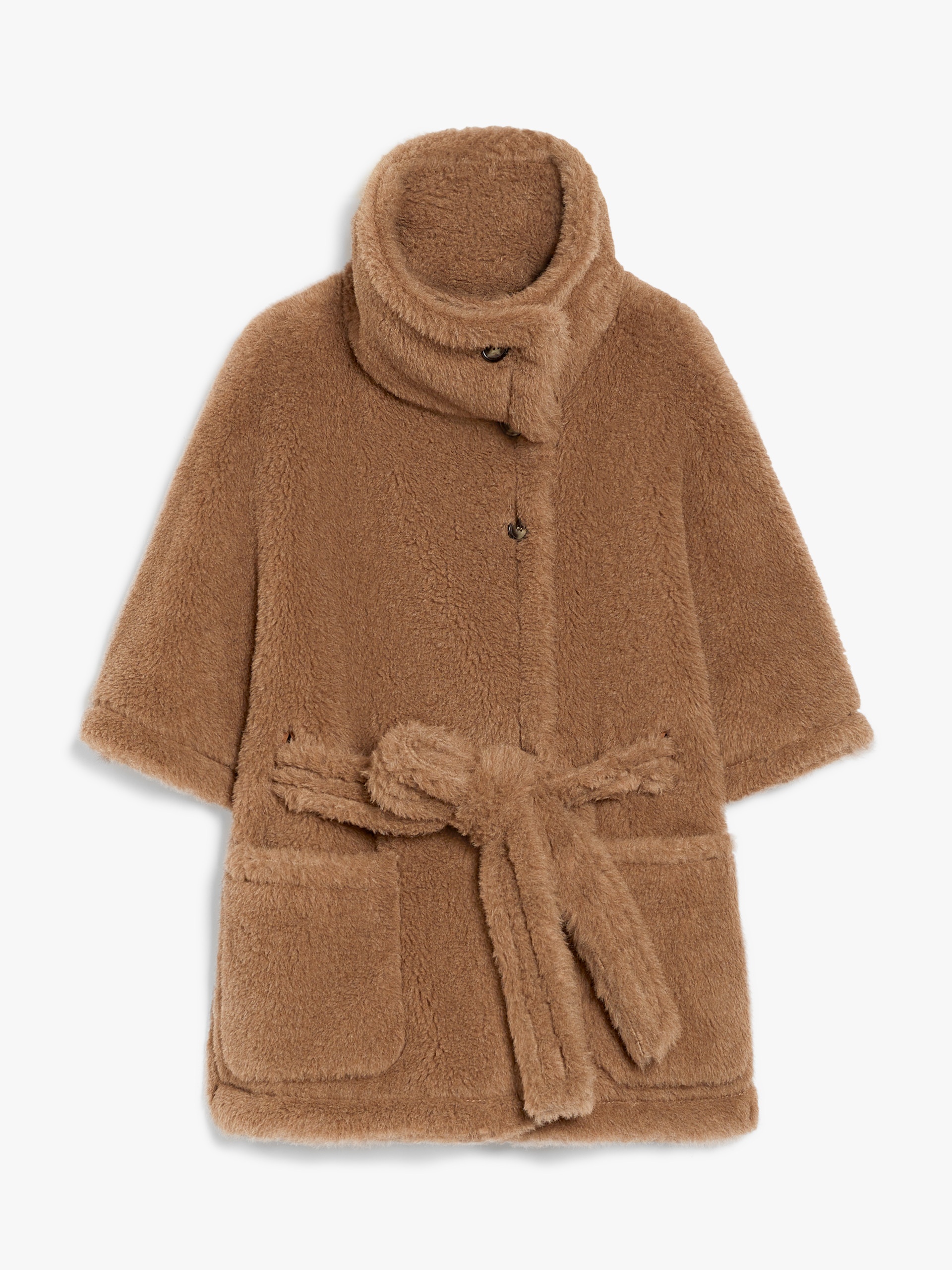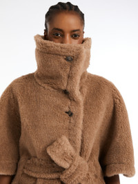 DETAILS Short cape made of iconic alpaca and wool Teddy fabric on a silk base. The construction features a wide, double-buttoned high neck that rests on the shoulders when opened. Patch pockets on the front and short kimono sleeves. Front closure with long belt inserted in the waist to tie at the front. COMPOSITION AND CARE Jersey fabric 63% alpaca, 26% cashmere, 11% silk; lining 100% viscose. Do not wash; do not bleach; do not tumble dry; do not iron; professionally dry clean perchloroethylene - mild process; do not wet clean.; do not iron the buttons. Distributed by Max Mara S.r.l., registered office in Reggio Emilia (Italy), Via Giulia Maramotti 4, 42124 (IT)