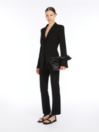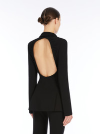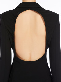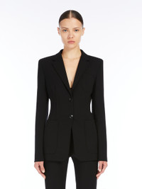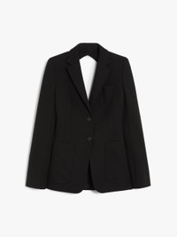 DETAILS Single-breasted blazer in compact stretch viscose jersey, featuring a slim fit with a gathered cut-out detail on the back. Classic lapel collar, long sleeves with wide slit at the wrist, a patch pocket on the chest and patch pockets on the front. Lined garment with side vents at the back, fastened with two visible buttons. COMPOSITION AND CARE Jersey fabric 78% viscose, 16% polyamide, 6% elastane; lining 65% acetate, 35% polyester. Do not wash; do not bleach; do not tumble dry; cool iron; professionally dry clean perchloroethylene - mild process; do not wet clean.; do not iron the buttons.; protect buttons before washing.; contains non-textile parts of animal origin. Distributed by Max Mara S.r.l., registered office in Reggio Emilia (Italy), Via Giulia Maramotti 4, 42124 (IT)