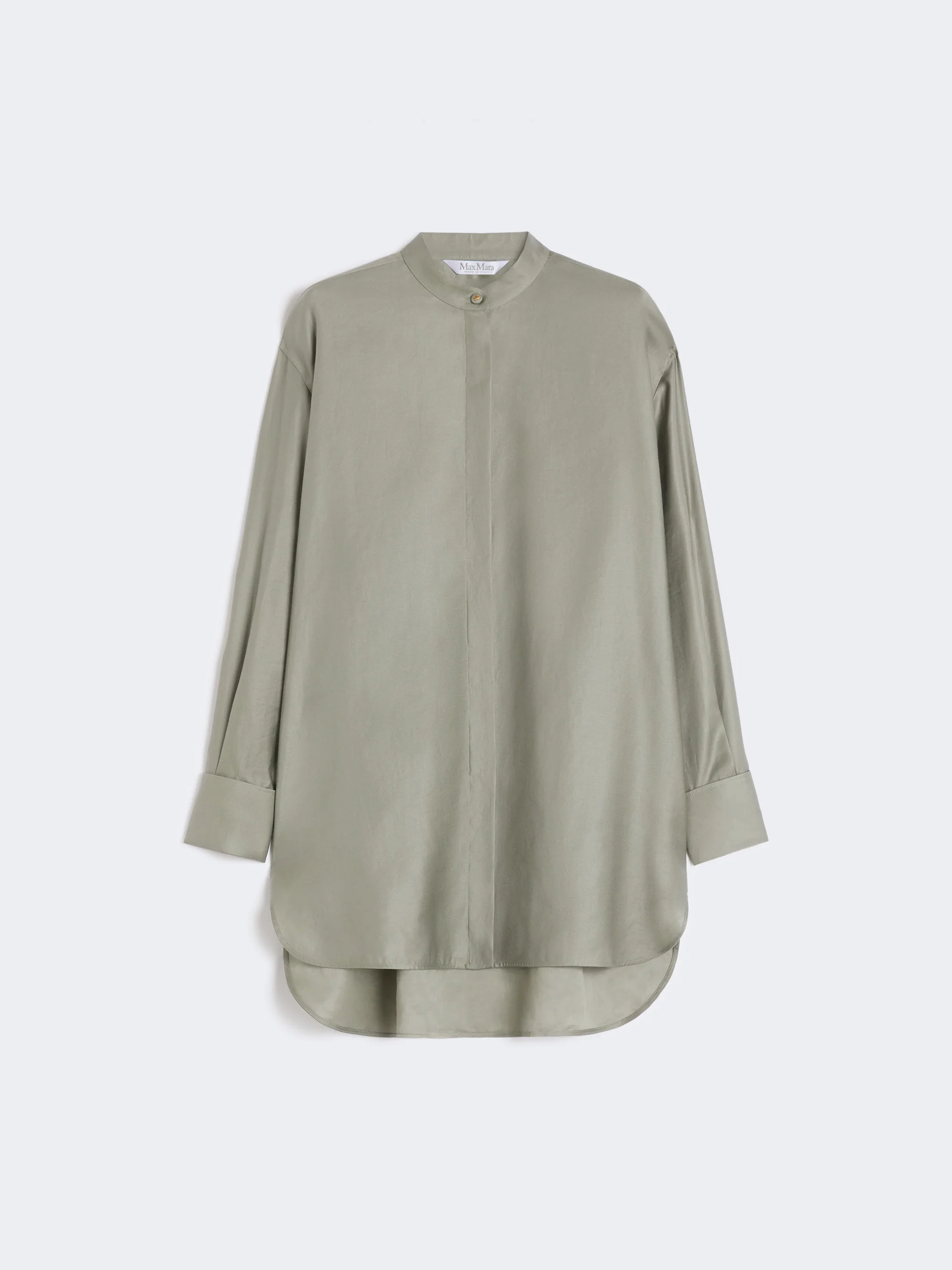 DETAILS Long, oversized shirt with yoke cut and double pleat on the back. Lightweight pure cotton satin shirt Mandarin collar Long sleeves with dropped shoulders Concealed front closure with visible top button Deep cuffs with cufflink button Rounded side slits Asymmetrical hem that is slightly longer at the back COMPOSITION AND CARE 100% cotton. Machine wash cold delicate cycle; do not bleach; do not tumble dry; line drying in the shade; cool iron; professionally dry clean perchloroethylene - mild process.; wash the garment while it is fastened.; do not iron the buttons.; protect buttons before washing.; turn the articles inside out before washing.; remove the cufflinks before washing. Distributed by Max Mara S.r.l., registered office in Reggio Emilia (Italy), Via Giulia Maramotti 4, 42124 (IT)