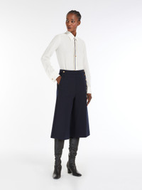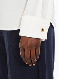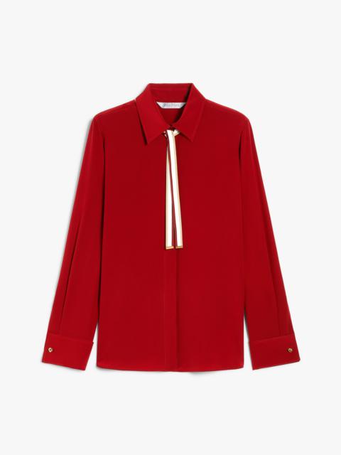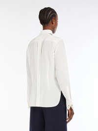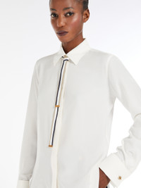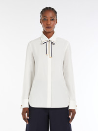 DETAILS Men’s-style shirt made from exquisite, lightweight pure silk crepe de Chine. The style features flowing lines with a classic pointed collar, removable two-tone ribbon necktie with button to detach it on the back neck and French cuffs. Finished with rounded side slits, a yoke seam and central pleat at the back. Concealed button fastening at the front. COMPOSITION AND CARE Fabric 100% silk; - exclusive of decoration. Do not wash; do not bleach; do not tumble dry; cool iron; professionally dry clean perchloroethylene - mild process; do not wet clean.; do not iron the buttons.; remove the decorations before washing.; remove the cufflinks before washing.; iron with a cloth between. Distributed by Max Mara S.r.l., registered office in Reggio Emilia (Italy), Via Giulia Maramotti 4, 42124 (IT)