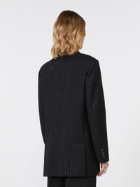 DETAILS Double-breasted tuxedo blazer, embellished with micro sequins embroidered with a pinstripe effect. Pure wool twill blazer Straight lines and double slit at the back Collar with peak lapels Long sleeves with slightly dropped shoulders and buttons on the cuffs Button fastening Chest pocket and pockets with applied flap on the front Lined in Monogram jacquard fabric COMPOSITION AND CARE Fabric 96% virgin wool, 4% polyamide; fabric exclusive of decoration; lining 65% acetate, 35% polyester. Do not wash; do not bleach; do not tumble dry; cool iron; professionally dry clean perchloroethylene - mild process; do not wet clean.; wash the garment while it is fastened.; do not iron the buttons.; protect buttons before washing.; turn the articles inside out before washing. Distributed by Max Mara S.r.l., registered office in Reggio Emilia (Italy), Via Giulia Maramotti 4, 42124 (IT)