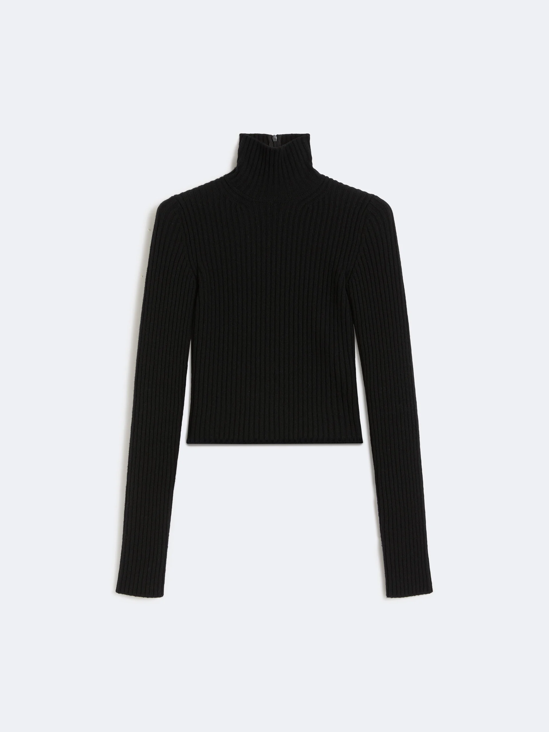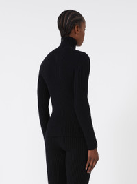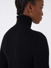 DETAILS Turtleneck jumper featuring a ribbed knit that accentuates the silhouette. Stretch wool and cashmere yarn turtleneck Figure-hugging High neck Long sleeves Half zip on the back of the neck with customised enamel slider COMPOSITION AND CARE 66% wool, 28% cashmere, 5% polyamide, 1% elastane. Hand wash cold (40°c max); do not bleach; do not tumble dry; flat drying in the shade; cool iron; professionally dry clean perchloroethylene - mild process; do not wet clean.; iron with a cloth between.; using neutral detergent. Distributed by Max Mara S.r.l., registered office in Reggio Emilia (Italy), Via Giulia Maramotti 4, 42124 (IT)