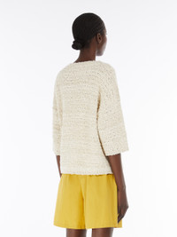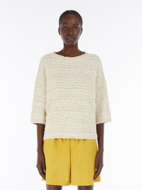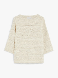 DETAILS Crew-neck jumper in a cotton blend yarn, featuring a tricot effect. The light metallic fibre adds a touch of sparkle. The style is completed by elbow-length sleeves, dropped shoulders and ribbed edges. COMPOSITION AND CARE Knitted fabric 72% cotton, 12% polyamide, 7% viscose, 6% metallised fiber, 3% polyester; hems 73% cotton, 9% polyamide, 9% metallised fiber, 6% viscose, 3% polyester. Hand wash cold; do not bleach; do not tumble dry; flat drying in the shade; cool iron; professionally dry clean perchloroethylene - mild process; do not wet clean.; iron with a cloth between.; using neutral detergent. Distributed by Max Mara S.r.l., registered office in Reggio Emilia (Italy), Via Giulia Maramotti 4, 42124 (IT)