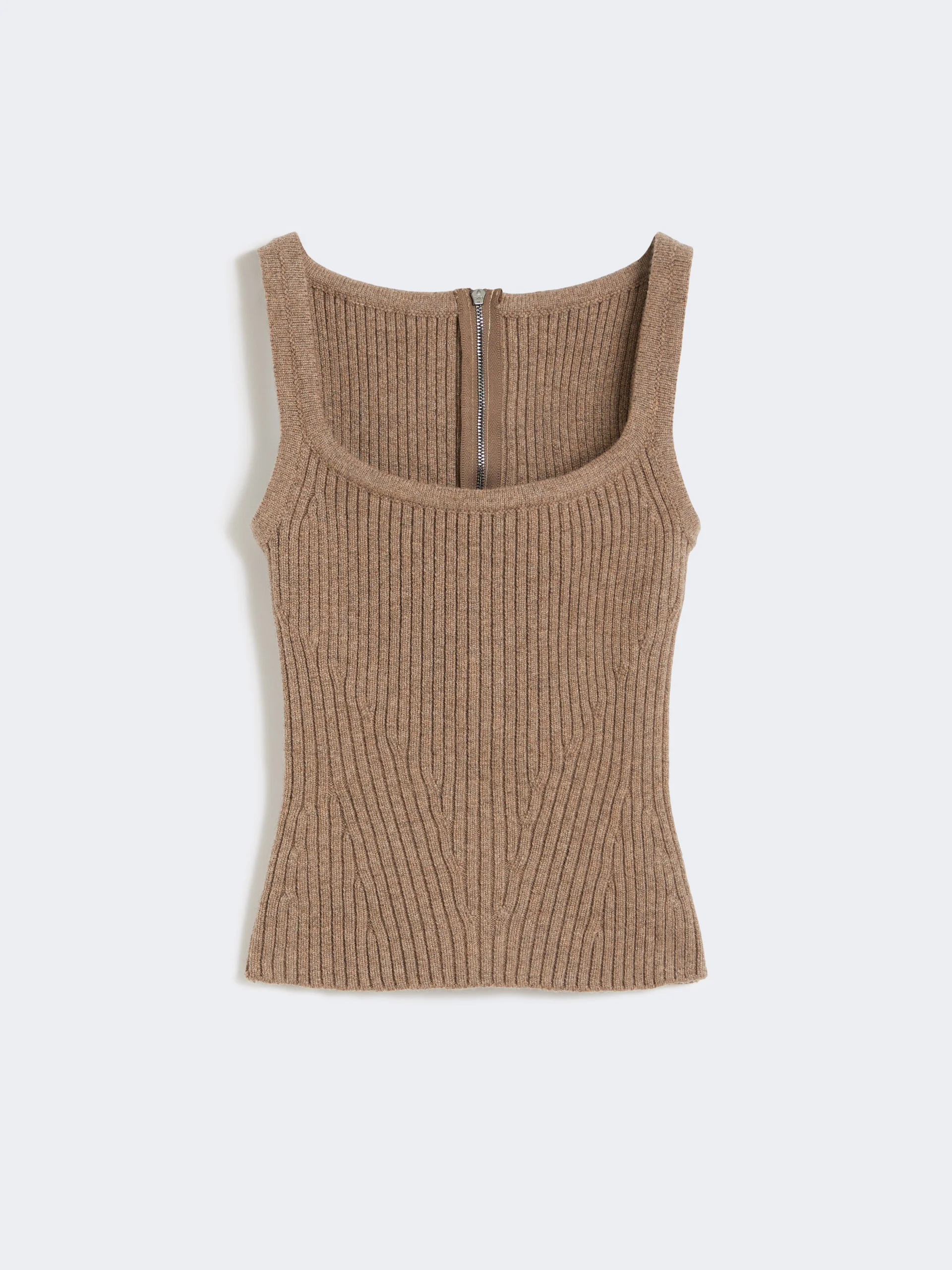 DETAILS Sleeveless corset-style top, with a ribbed finish that accentuates the silhouette. Stretch wool and cashmere mouline yarn top Figure-hugging Square neckline Thin shoulder straps Back concealed zip fastening COMPOSITION AND CARE 66% wool, 28% cashmere, 5% polyamide, 1% elastane. Hand wash cold (40°c max); do not bleach; do not tumble dry; flat drying in the shade; cool iron; professionally dry clean perchloroethylene - mild process; do not wet clean.; iron with a cloth between.; using neutral detergent. Distributed by Max Mara S.r.l., registered office in Reggio Emilia (Italy), Via Giulia Maramotti 4, 42124 (IT)