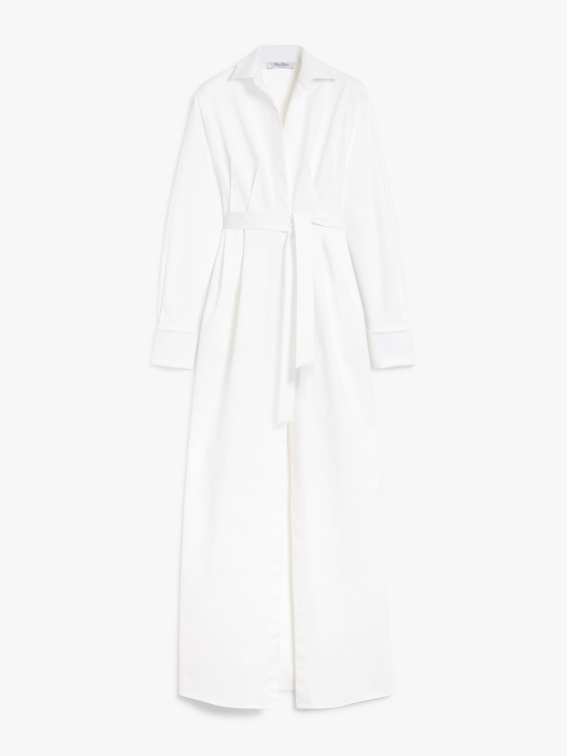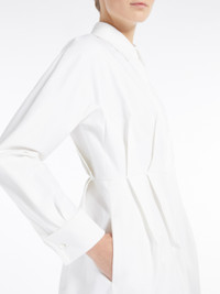 DETAILS Long shirt dress made of stretch cotton gabardine. The garment features a unique silhouette, defined by a waist seam and a full skirt with stitched pleats that add volume. Classic shirt collar, long sleeves with wide cuff and cufflink button. The matching belt allows you to accentuate the waist. Concealed front fastening with deep central slit at the hem. COMPOSITION AND CARE 94% cotton, 6% elastane. Hand wash cold; do not bleach; do not tumble dry; line drying in the shade; cool iron; professionally dry clean perchloroethylene - mild process; do not wet clean.; wash the garment while it is fastened.; turn the articles inside out before washing.; remove the cufflinks before washing.; contains non-textile parts of animal origin. Distributed by Max Mara S.r.l., registered office in Reggio Emilia (Italy), Via Giulia Maramotti 4, 42124 (IT)