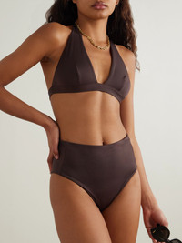 Designed to be worn with the matching 'Sabina' briefs, Max Mara's 'Ariella' halterneck bikini top comes in the label's rich 'Coffee' shade. It has a hint of stretch for comfort and ties at the back. Size & Fit - Fits true to size, take your normal size - Model is 175cm/ 5'9", bra size 32B and is wearing a size XSmall Model measurements: - Bust: 84cm/ 33” - Waist: 65cm/ 25.5” - Hip: 91cm/ 36” Details & Care - Dark-brown stretch-polyamide - Ties at neck and back - Hand wash - Designer color: Coffee - Lotion, sunscreen, oil and chlorine can cause discoloration of this item; this is not a manufacturing defect. Please follow care instructions to keep your swimwear in the best condition