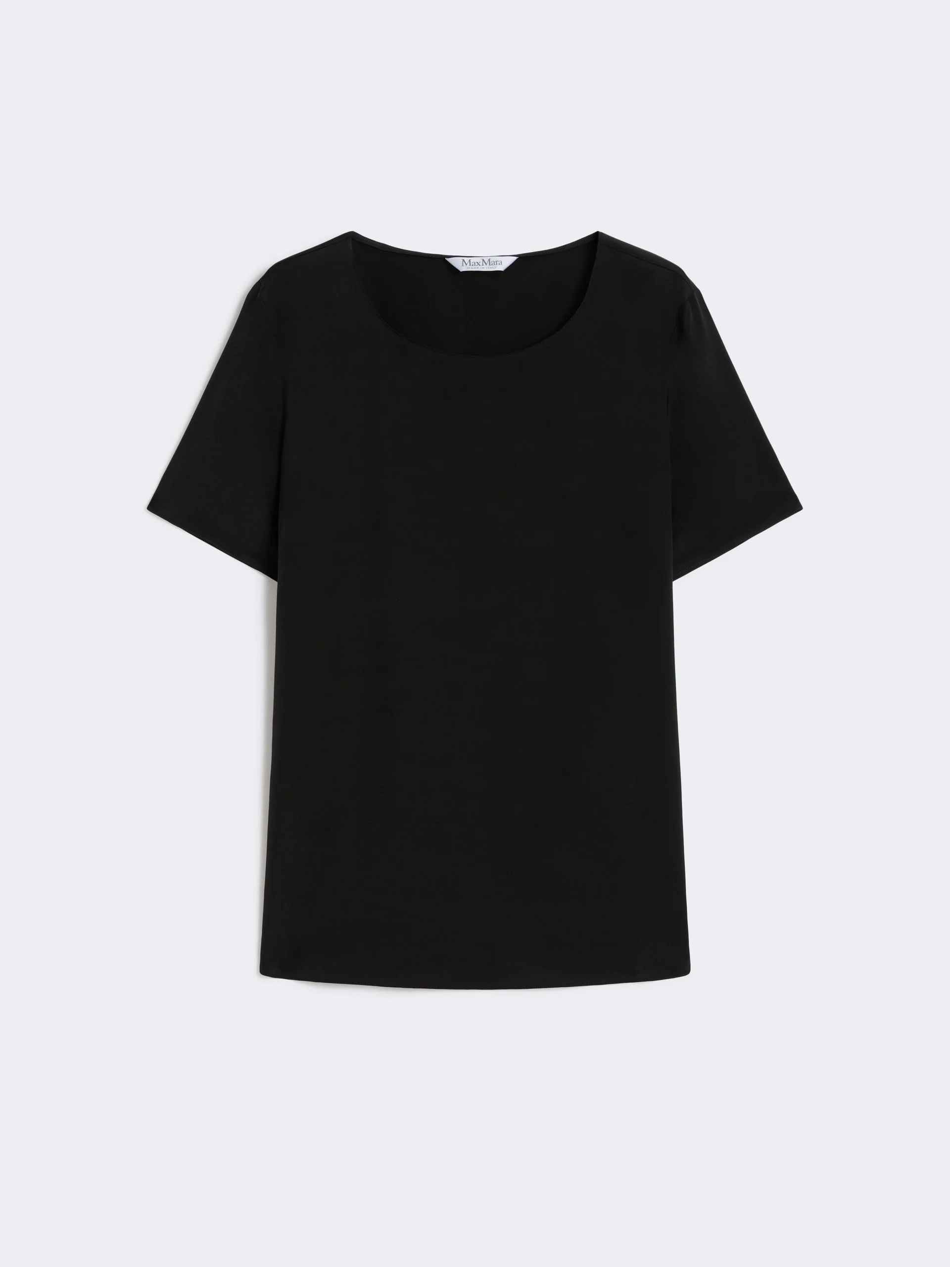 DETAILS Basic T-shirt with a relaxed fit. Stretch silk cady T-shirt Crew neck Short set-in sleeves Finished with a stitching motif Rounded hem COMPOSITION AND CARE 93% silk, 7% elastane. Do not wash; do not bleach; do not tumble dry; cool iron; professionally dry clean perchloroethylene - mild process; do not wet clean. Distributed by Max Mara S.r.l., registered office in Reggio Emilia (Italy), Via Giulia Maramotti 4, 42124 (IT)
