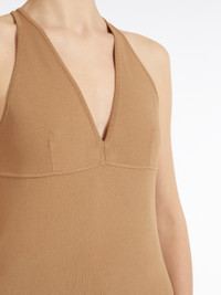 DETAILS Close-fitting sleeveless top made in a viscose blend yarn. The garment has a halterneck with a wide V-neck on the front and triangle cups. COMPOSITION AND CARE 75% viscose, 25% polyester. Hand wash cold; do not bleach; do not tumble dry; flat drying in the shade; cool iron; professionally dry clean perchloroethylene - mild process; do not wet clean.; iron with a cloth between.; using neutral detergent. Distributed by Max Mara S.r.l., registered office in Reggio Emilia (Italy), Via Giulia Maramotti 4, 42124 (IT)