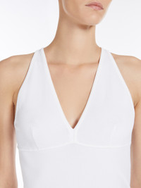 DETAILS Close-fitting sleeveless top made in a viscose blend yarn. The garment has a halterneck with a wide V-neck on the front and triangle cups. COMPOSITION AND CARE 75% viscose, 25% polyester. Hand wash cold; do not bleach; do not tumble dry; flat drying in the shade; cool iron; professionally dry clean perchloroethylene - mild process; do not wet clean.; iron with a cloth between.; using neutral detergent. Distributed by Max Mara S.r.l., registered office in Reggio Emilia (Italy), Via Giulia Maramotti 4, 42124 (IT)