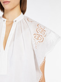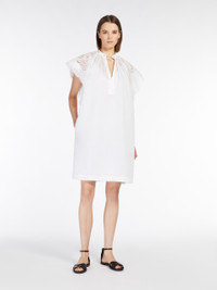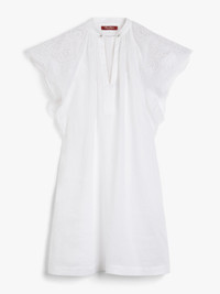 DETAILS Short ramie cloth dress with a mandarin collar and teardrop motif with cufflink fastening on the decollete. The volume of the dress features short flounced sleeves with placed see-through effect broderie anglaise embroidery and inset side pockets. Matching slip in crepe de Chine. COMPOSITION AND CARE Dress fabric 100% ramie; embroidery thread 100% polyester. Petticoat 100% cotton. Dress: machine wash cold delicate cycle; do not bleach; do not tumble dry; line drying in the shade; cool iron; professionally dry clean perchloroethylene - mild process.; Put this item into a string bag before washing it.; Turn the articles inside out before washing.; Remove the cufflinks before washing. Petticoat: machine wash cold delicate cycle; do not bleach; do not tumble dry; line drying in the shade; cool iron; professionally dry clean perchloroethylene - mild process. Distributed by Max Mara S.r.l., registered office in Reggio Emilia (Italy), Via Giulia Maramotti 4, 42124 (IT)
