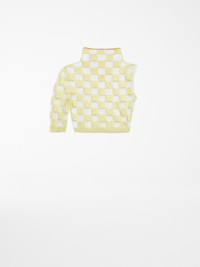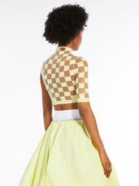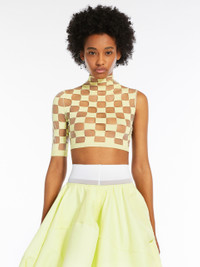DETAILS Stretch-viscose top, with transparent yarn intarsias that create a checkerboard effect. Asymmetric construction, sleeveless on the left with a polo neck. Rib-knit cuffs and hem. • Stretch viscose top • Intarsias in transparent yarn • Fitted • Asymmetric construction, sleeveless on the left • Rib-knit cuffs and hem COMPOSITION AND CARE Knitted fabric 1 83% viscose, 17% polyester; knitted fabric 2 100% nylon. Do not wash; do not bleach; do not tumble dry; cool iron; professionally dry clean perchloroethylene - mild process; do not wet clean.; iron with a cloth between.; don’t iron the labels. Distributed by Max Mara S.r.l., registered office in Reggio Emilia (Italy), Via Giulia Maramotti 4, 42124 (IT)